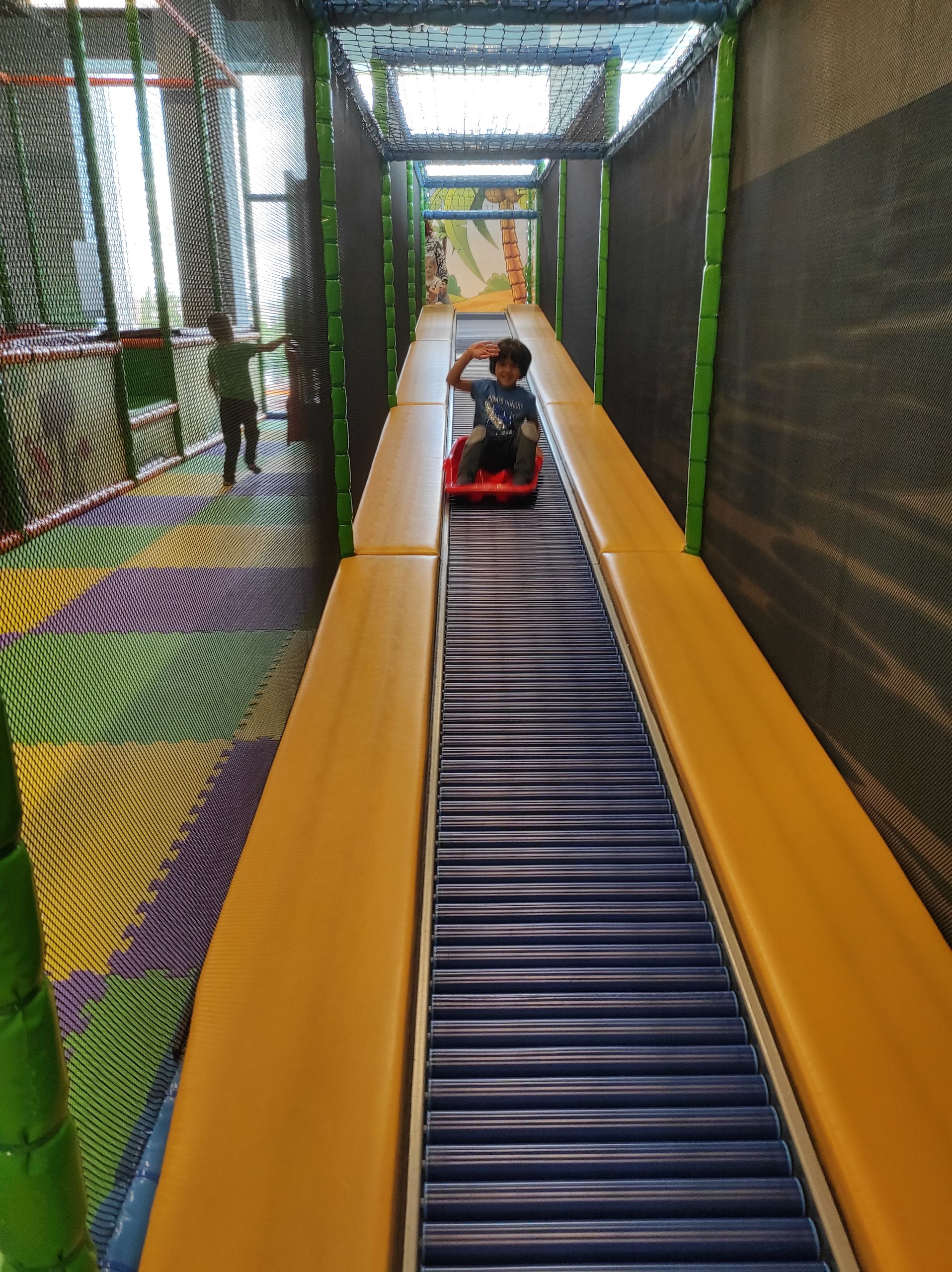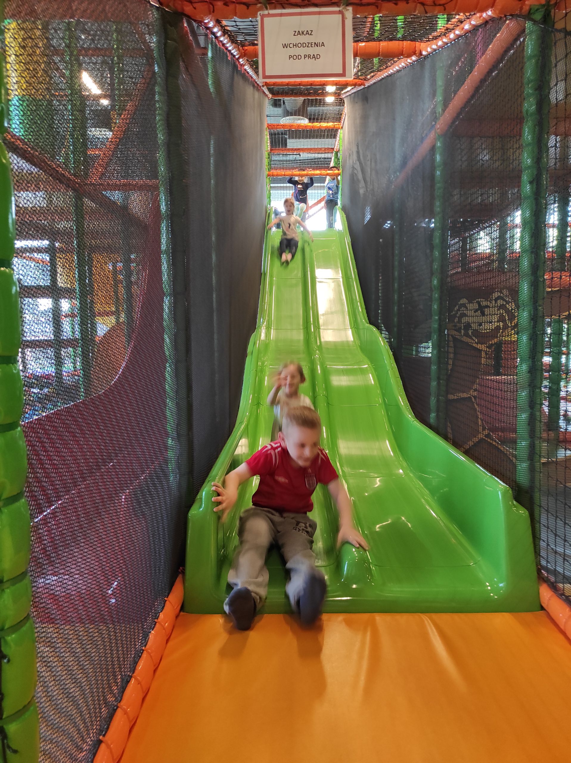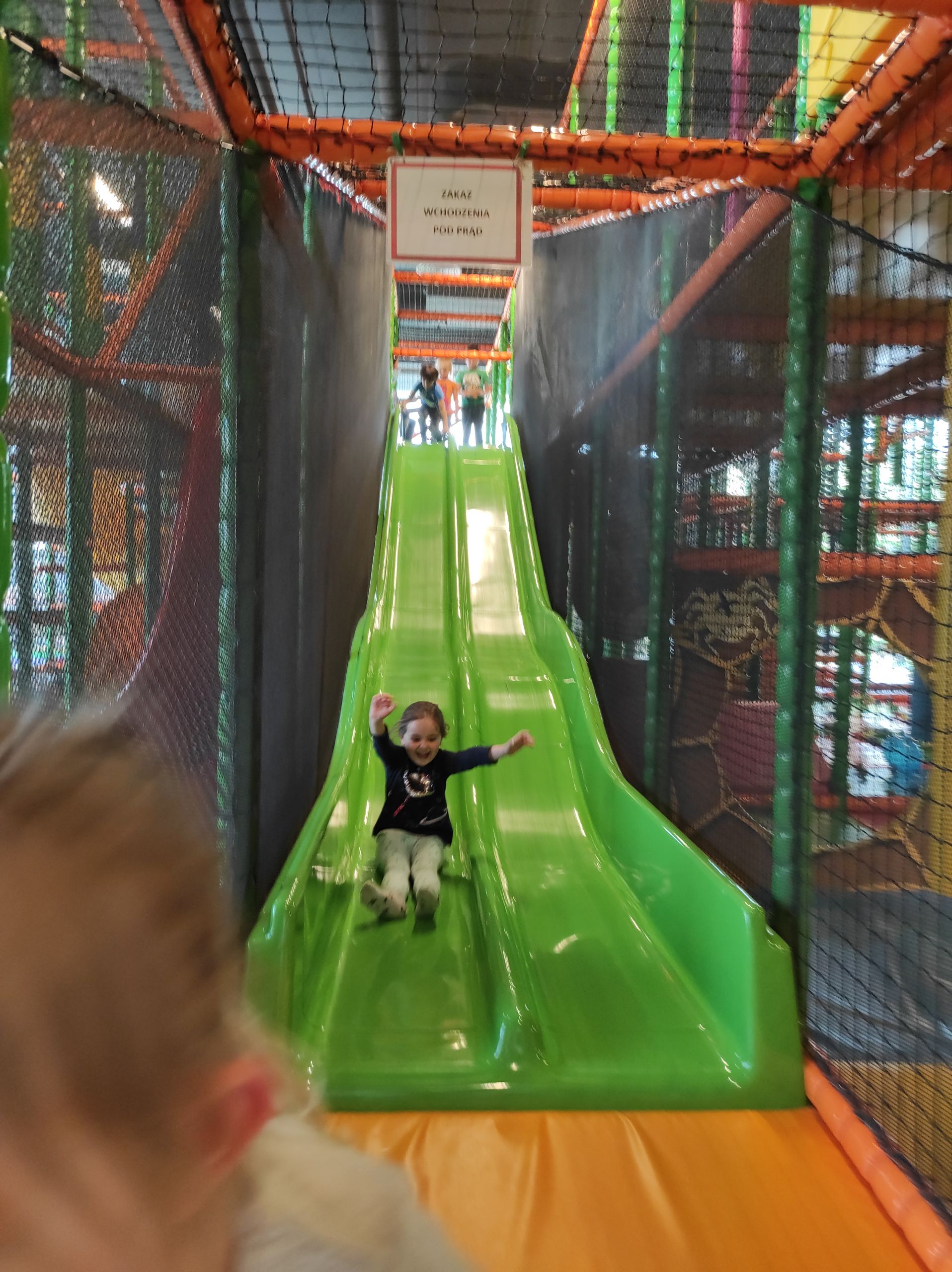 - Uśmiechnięty chłopiec zjeżdża z zielonej zjeżdżalni.