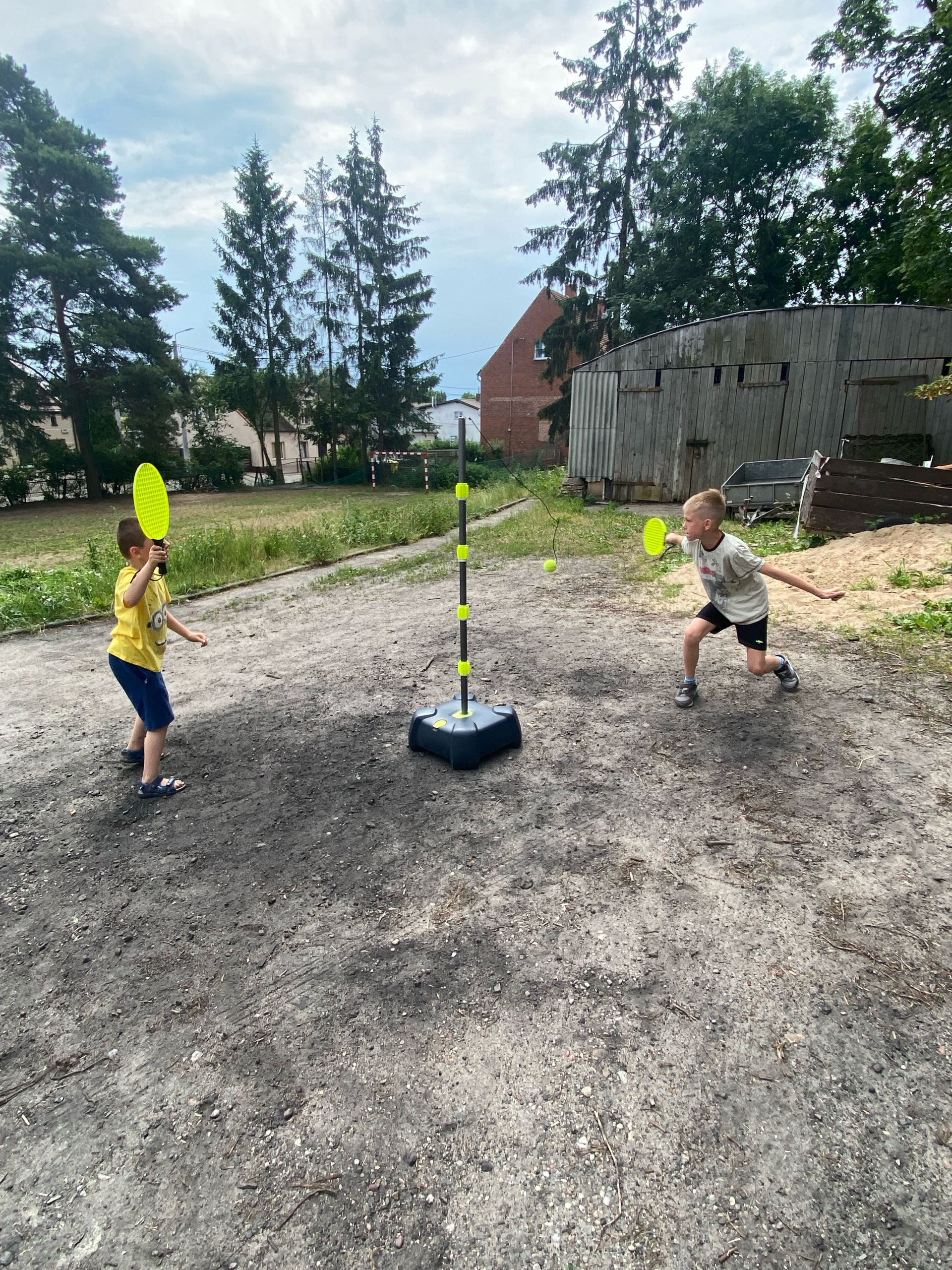 - Dwóch chłopców odbija piłkę zamocowaną na słupku.