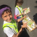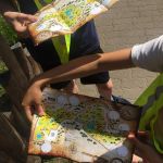 - Uśmiechnięta dziewczynka pokazuje punkt na mapie, którą trzyma w ręce. W tle druga dziewczynka przygląda się takiej samej mapie.