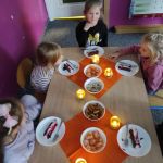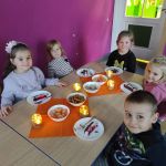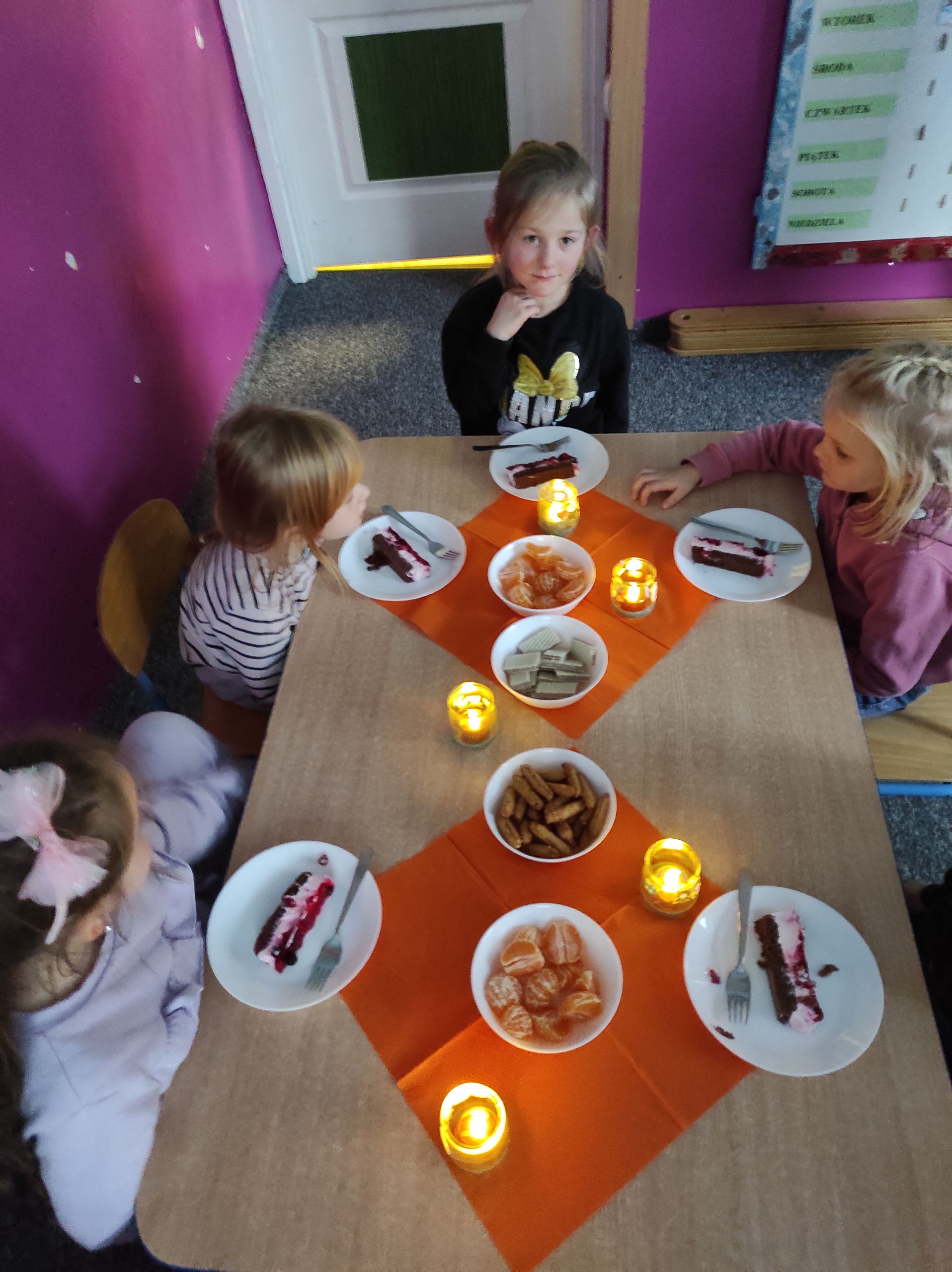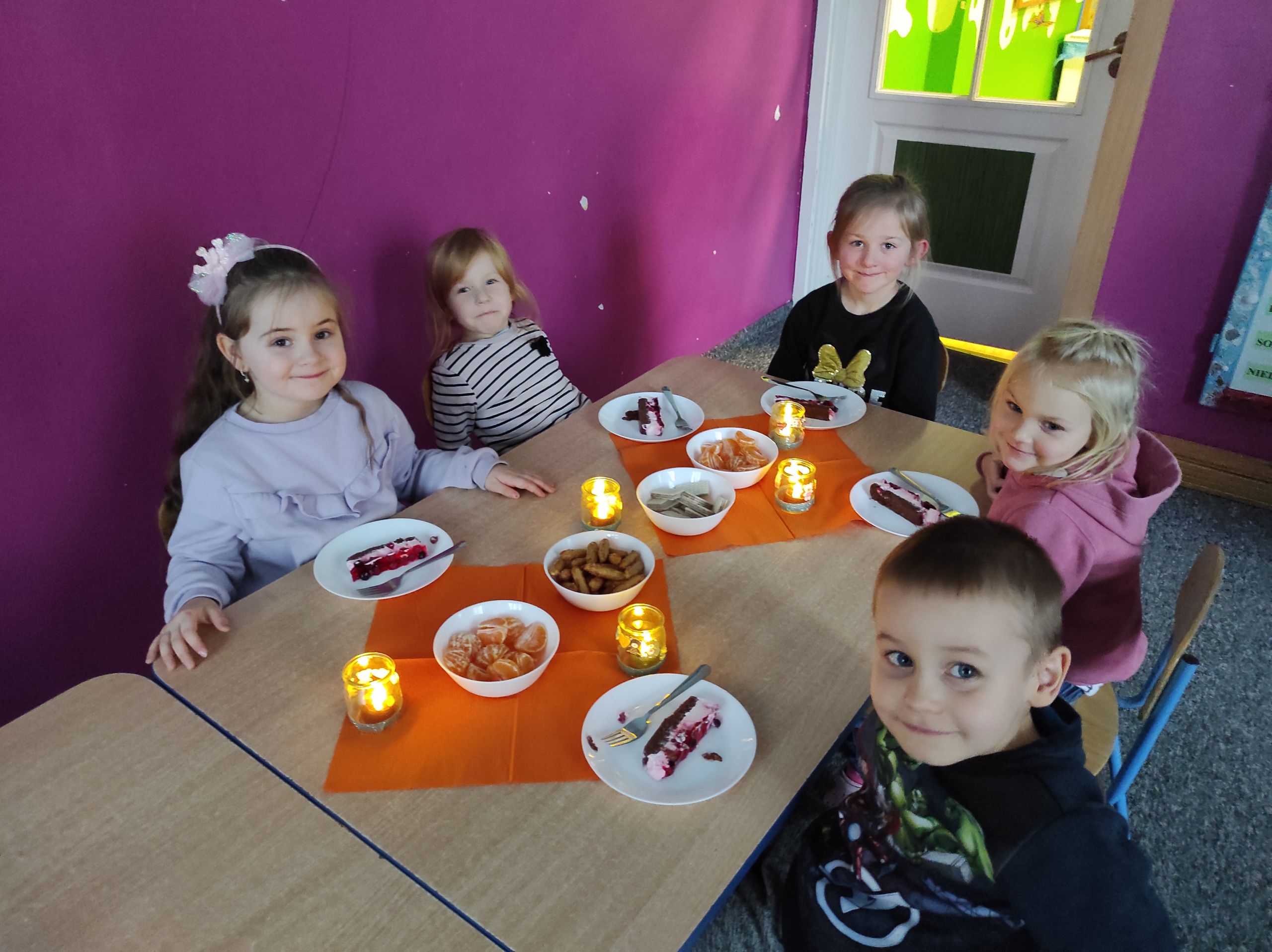 - Grupa dzieci siedzi przy stole. Na stole leżą pomarańczowe serwetki, są zapalone ozdobne świeczniki oraz leżą miski i talerzyki z poczęstunkiem.