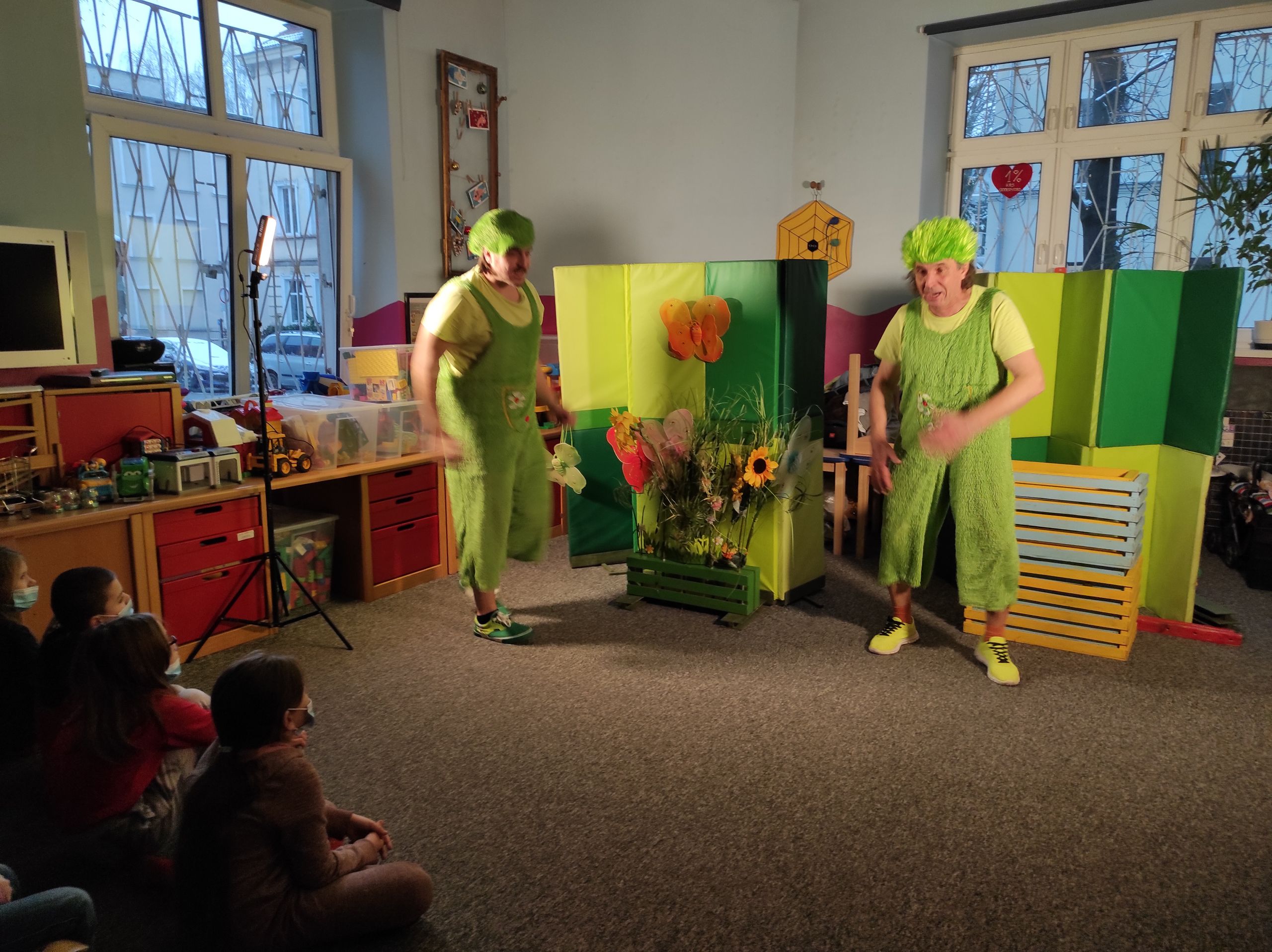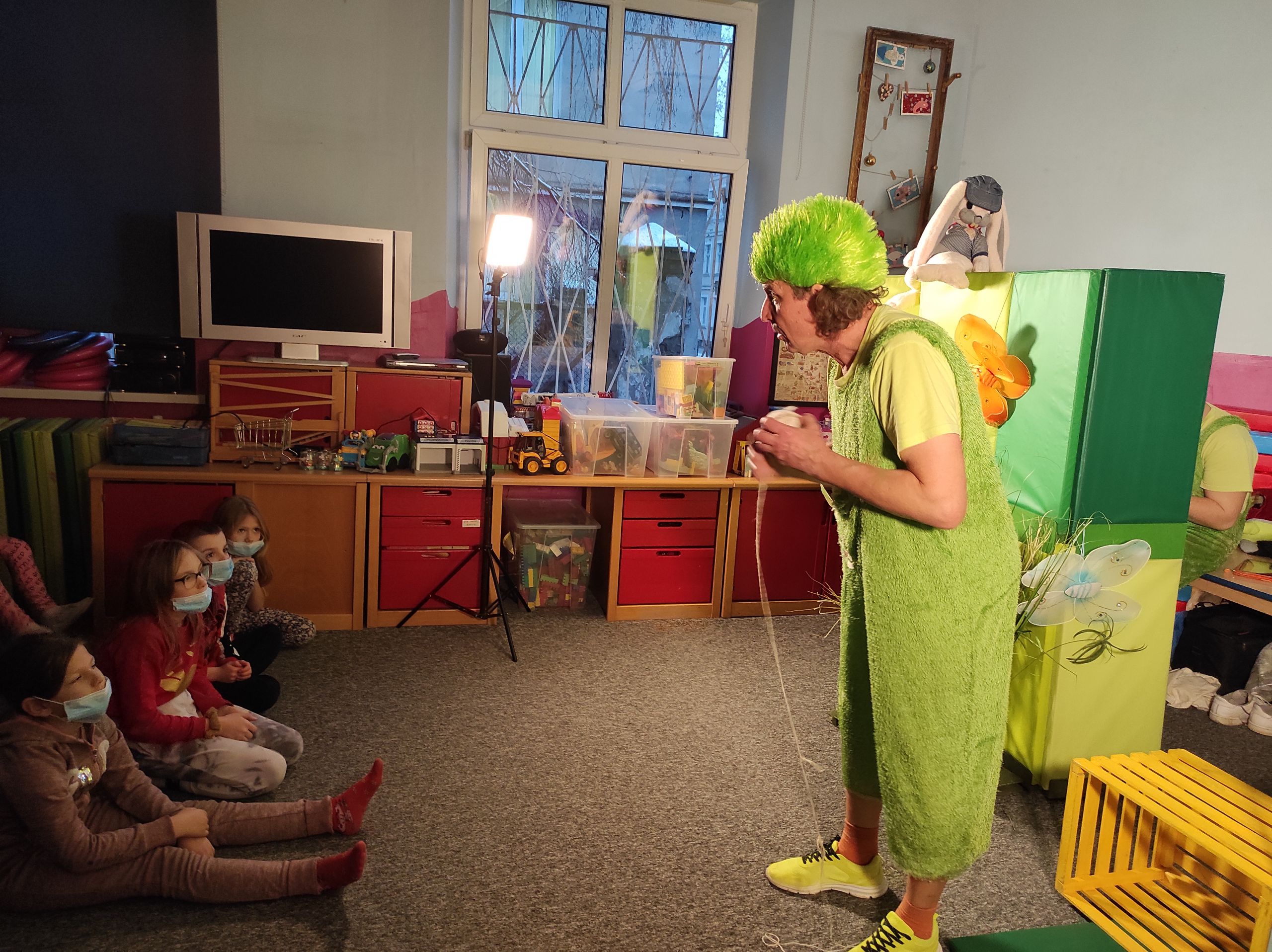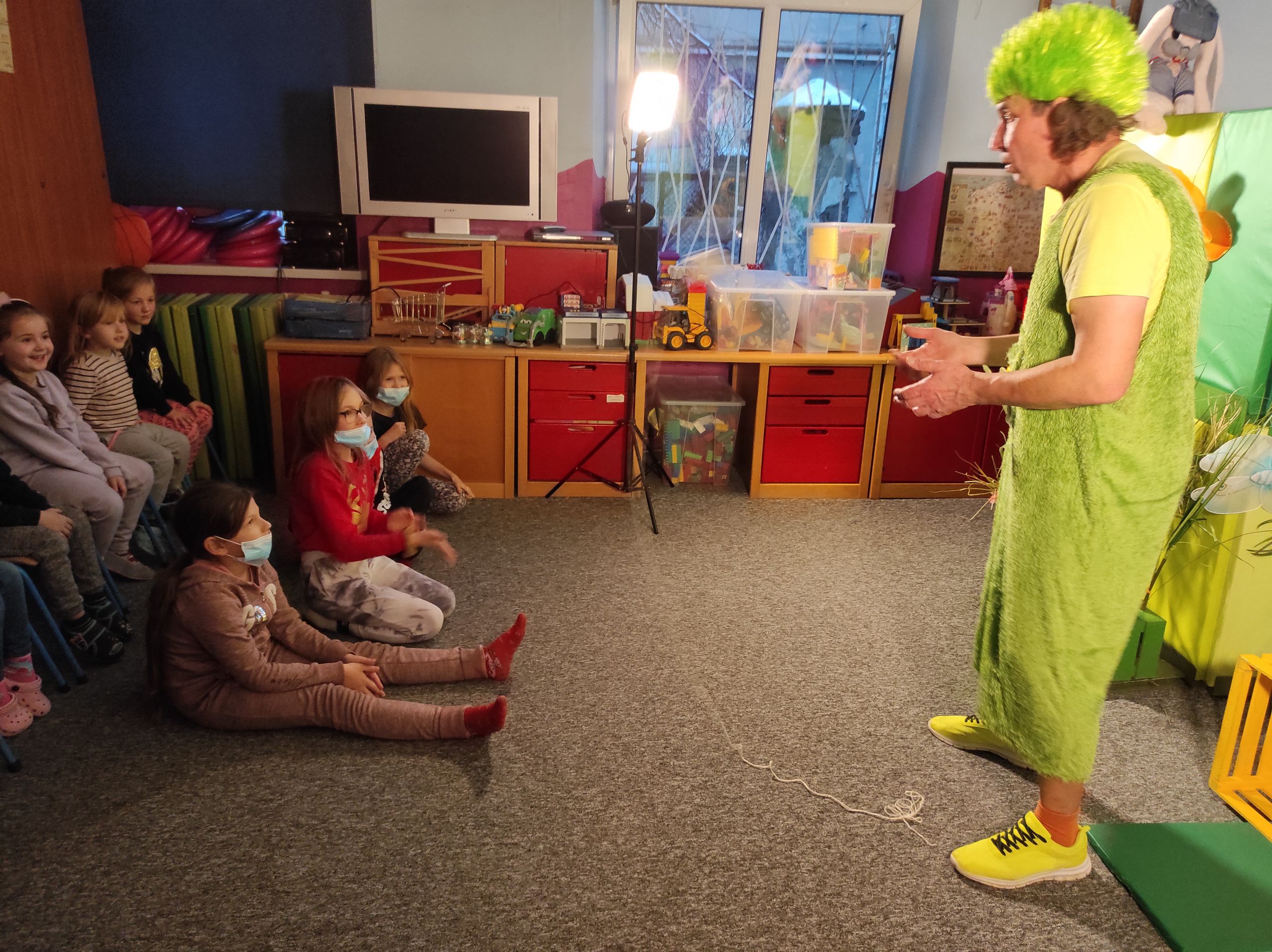 30.11.2021r. odwiedził nas Teatr Qfer z przezabawnym przedstawieniem pod tytułem „Zajączek Bączek”. Było dużo muzyki, śpiewania, trochę tańców i baaardzo dużo śmiechu. Przedstawienia Teatru Qfer są wyjątkowe dla naszych podopiecznych, ponieważ angażują ich w przebieg całego spektaklu; dzieci mogą odpowiadać na zagadki, układać rymowanki, tańczyć oraz śpiewać. Bardzo dziękujemy za odwiedziny i przednią zabawę!