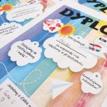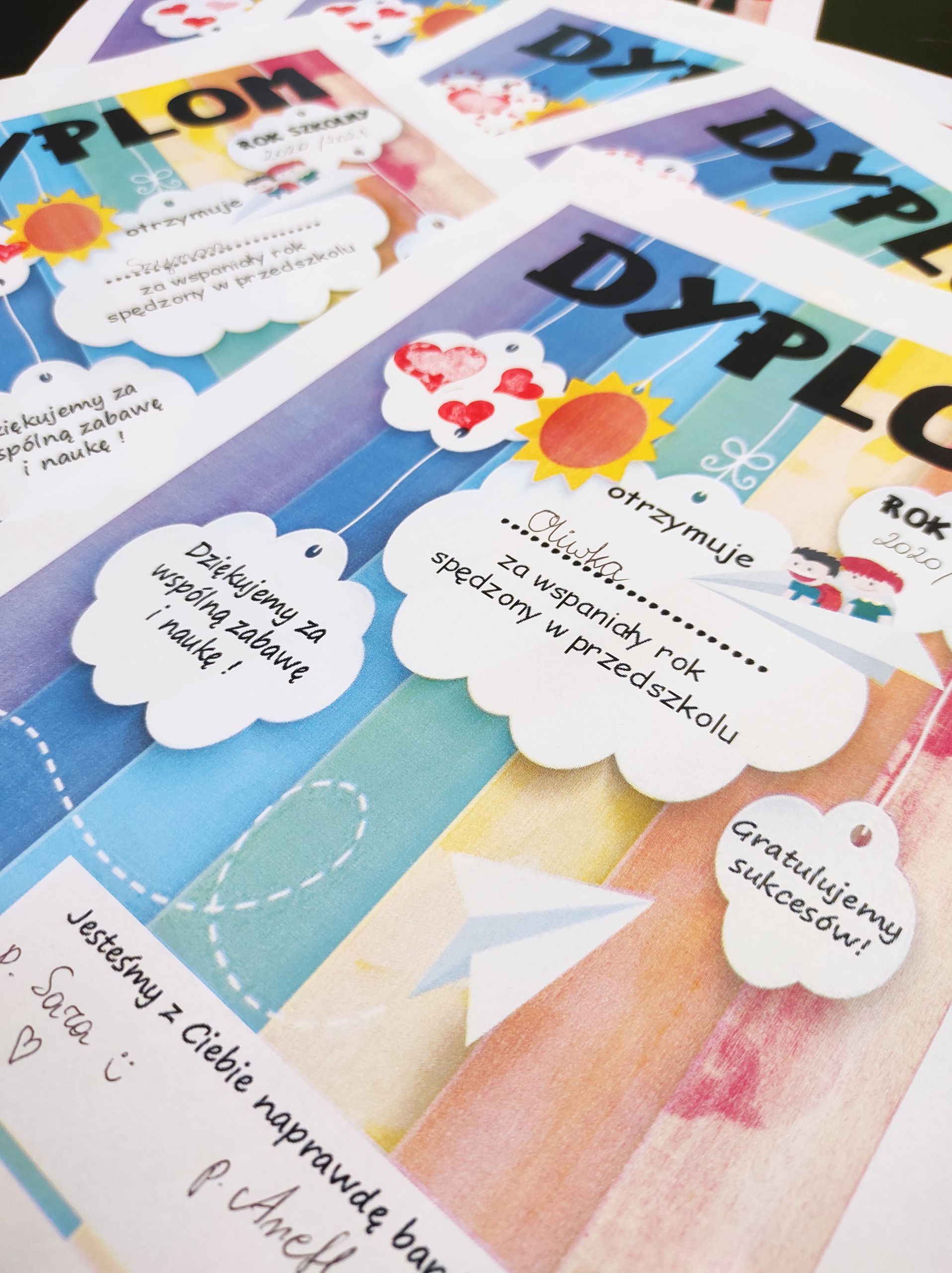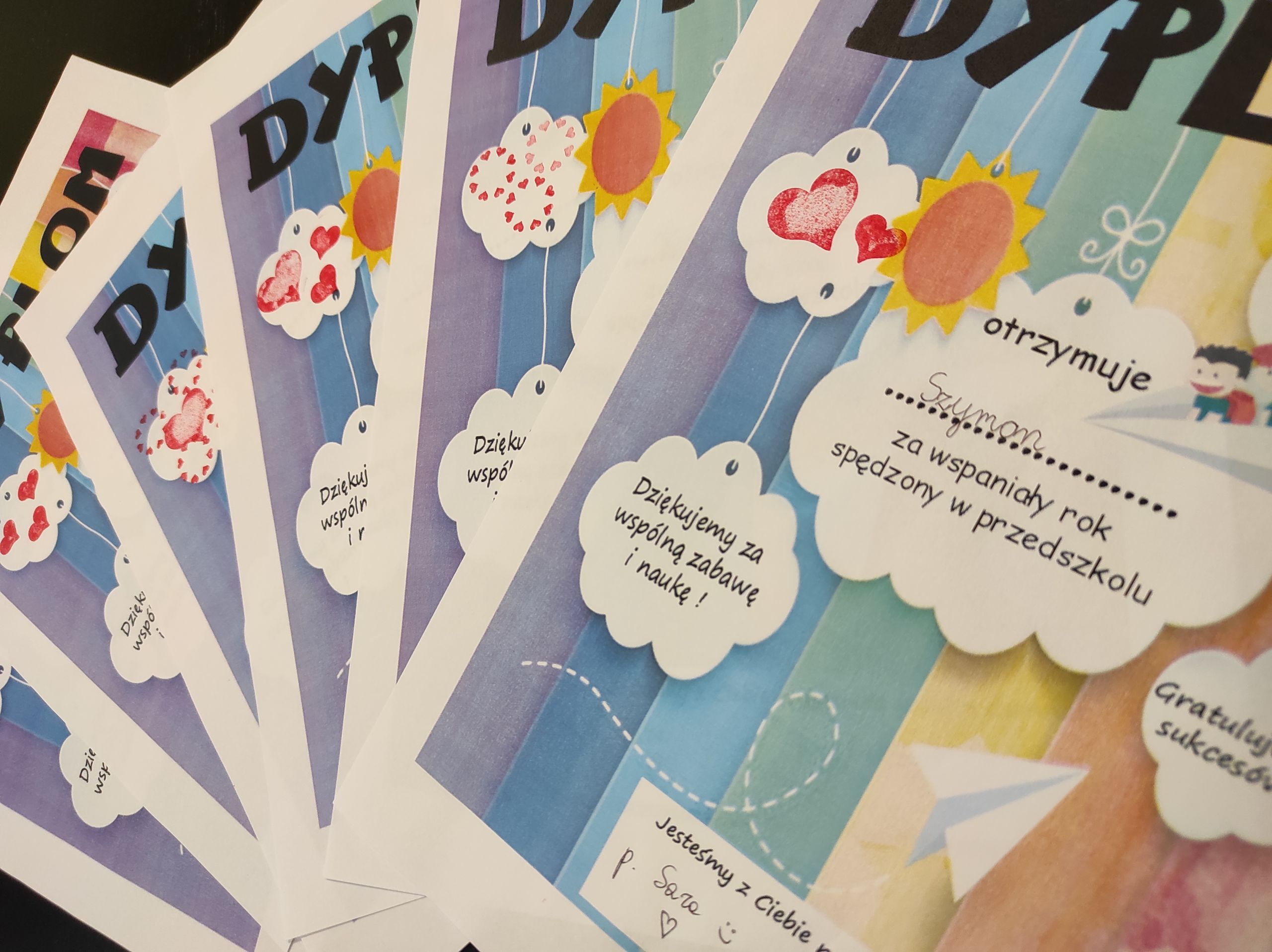 - Kolorowe dyplomy dla przedszkolaków leżą na stole. Są podpisane imionami oraz zawierają słowa podziękowań i gratulacji.