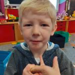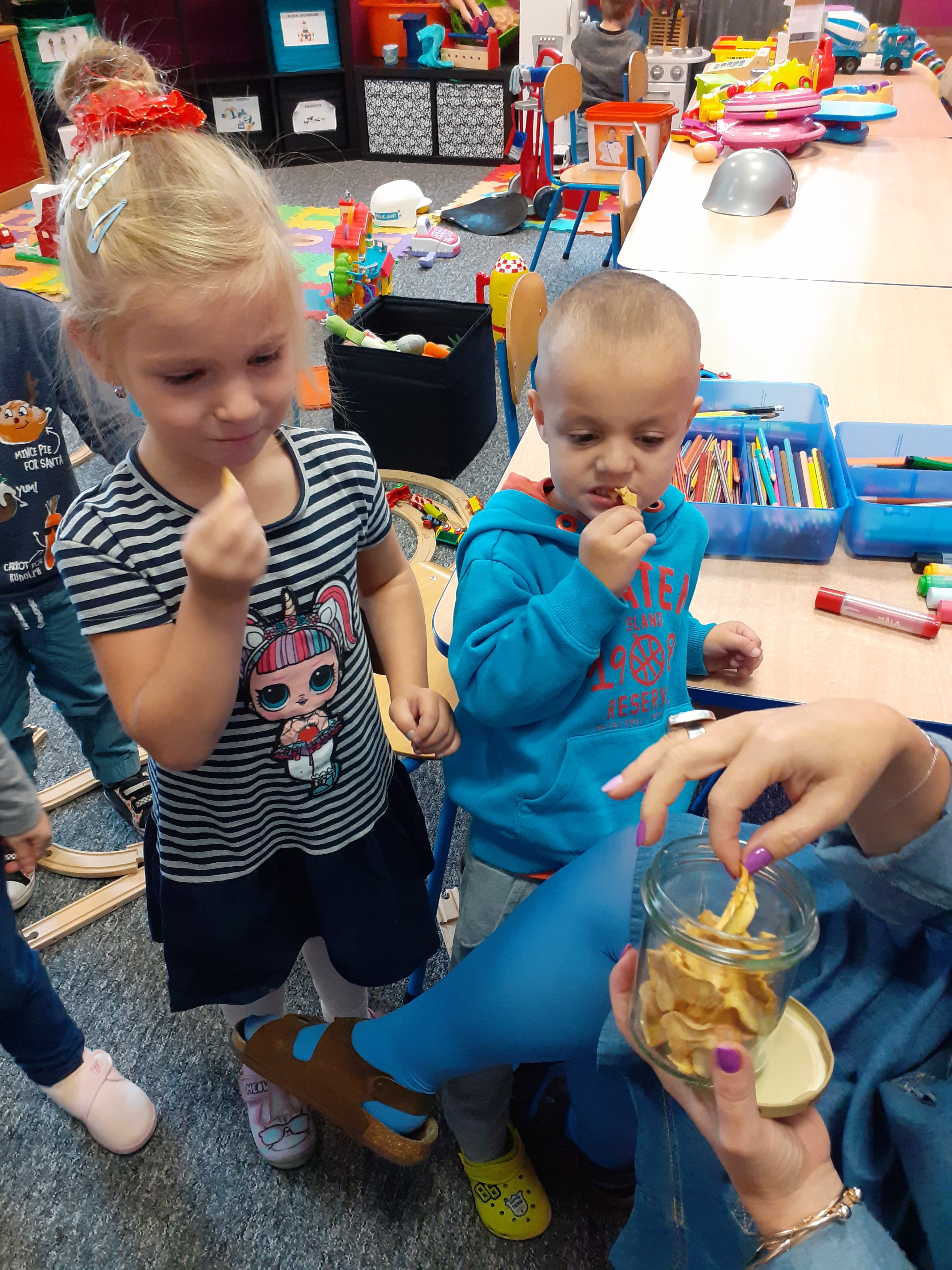 07.10.2019r. również „Radosne Krasnale” skosztowały suszonych jabłek przygotowanych przez starszą grupę. Dzieci zajadały się ze smakiem i dowiedziały się, że ze zdrowych produktów też można stworzyć pyszne przekąski.