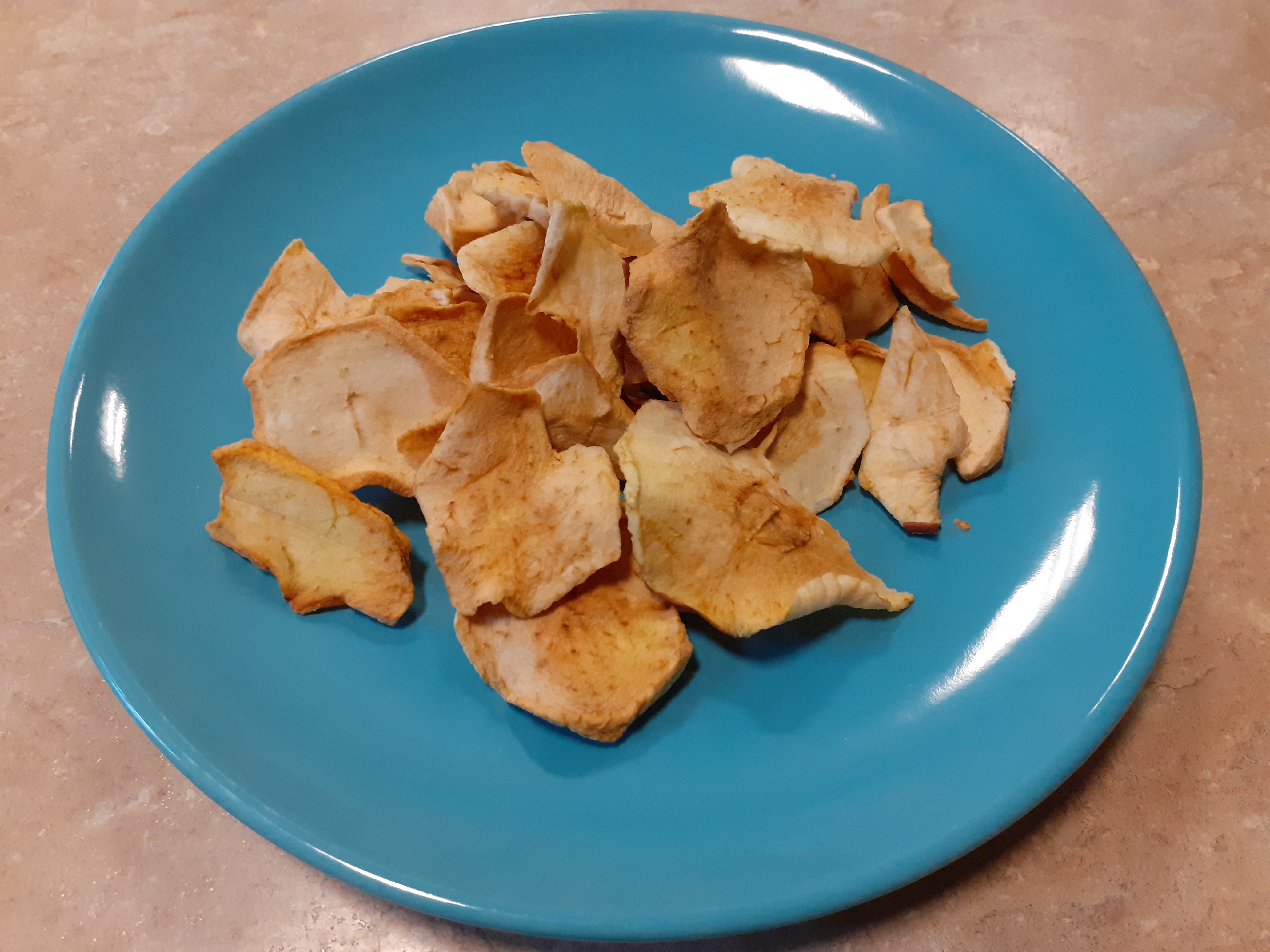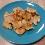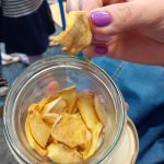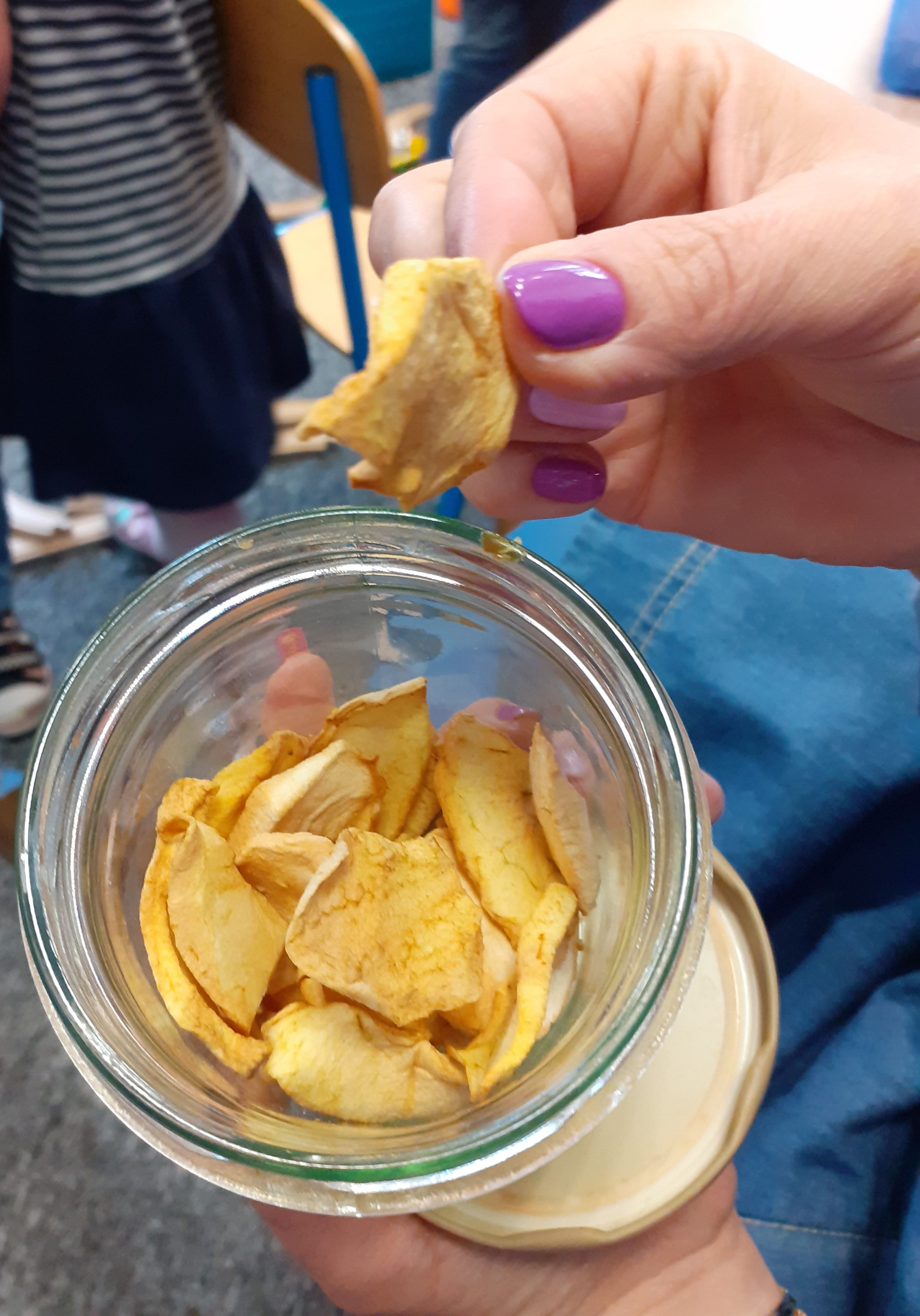 - W centrum szklane naczynie wypełnione suszonymi jabłkami, u góry kobieca dłoń, która trzyma kawałek suszonego jabłka.