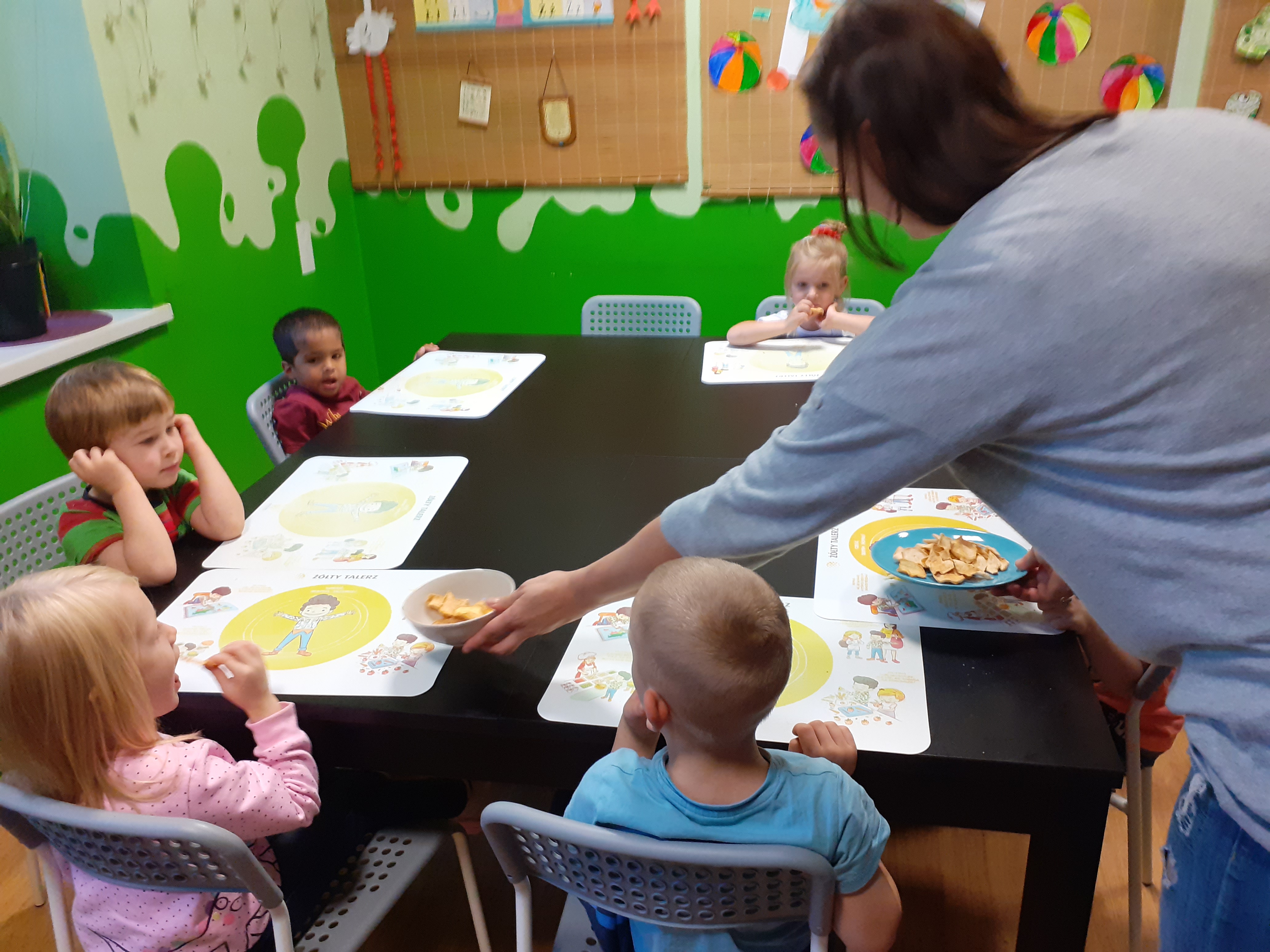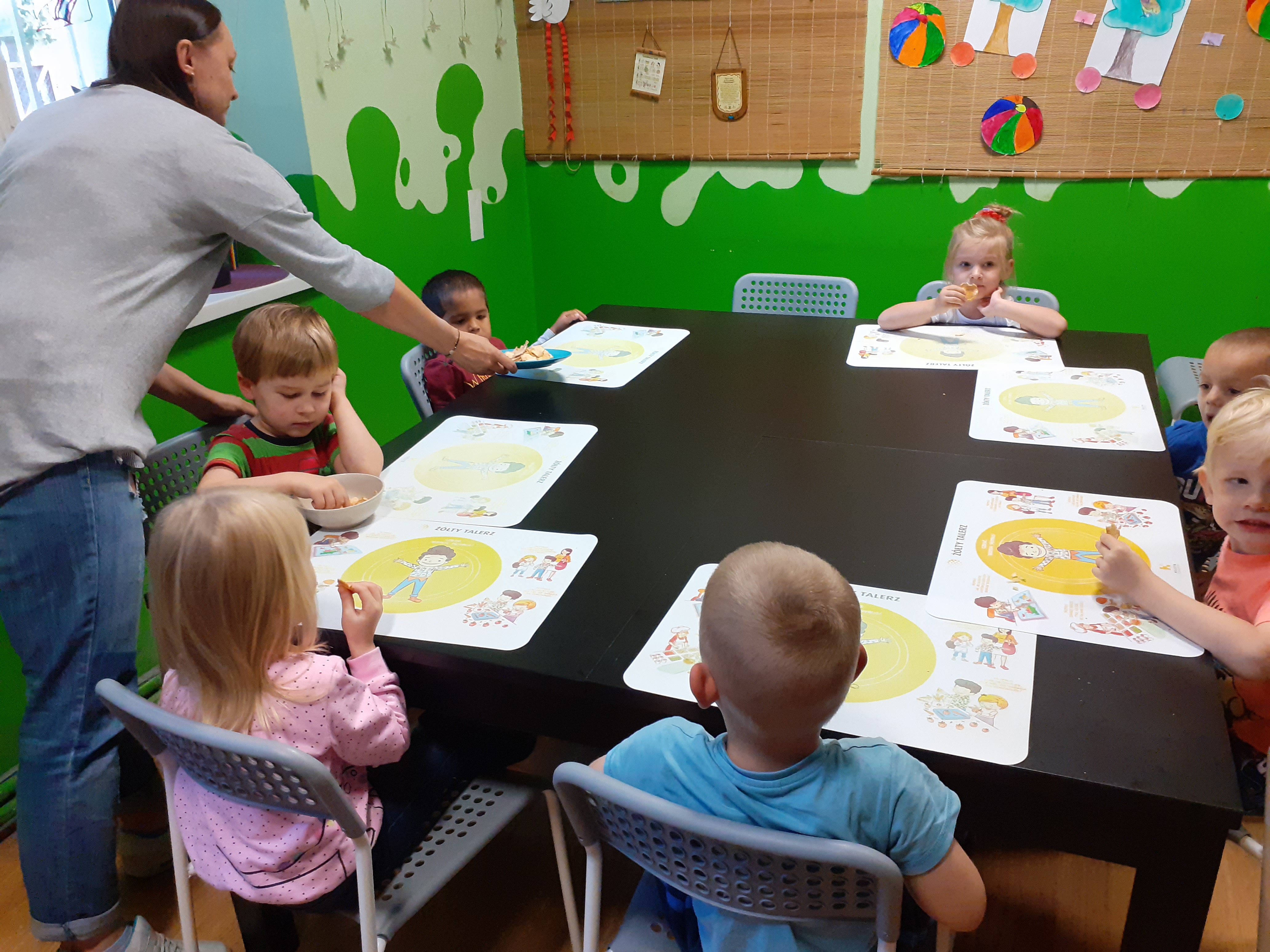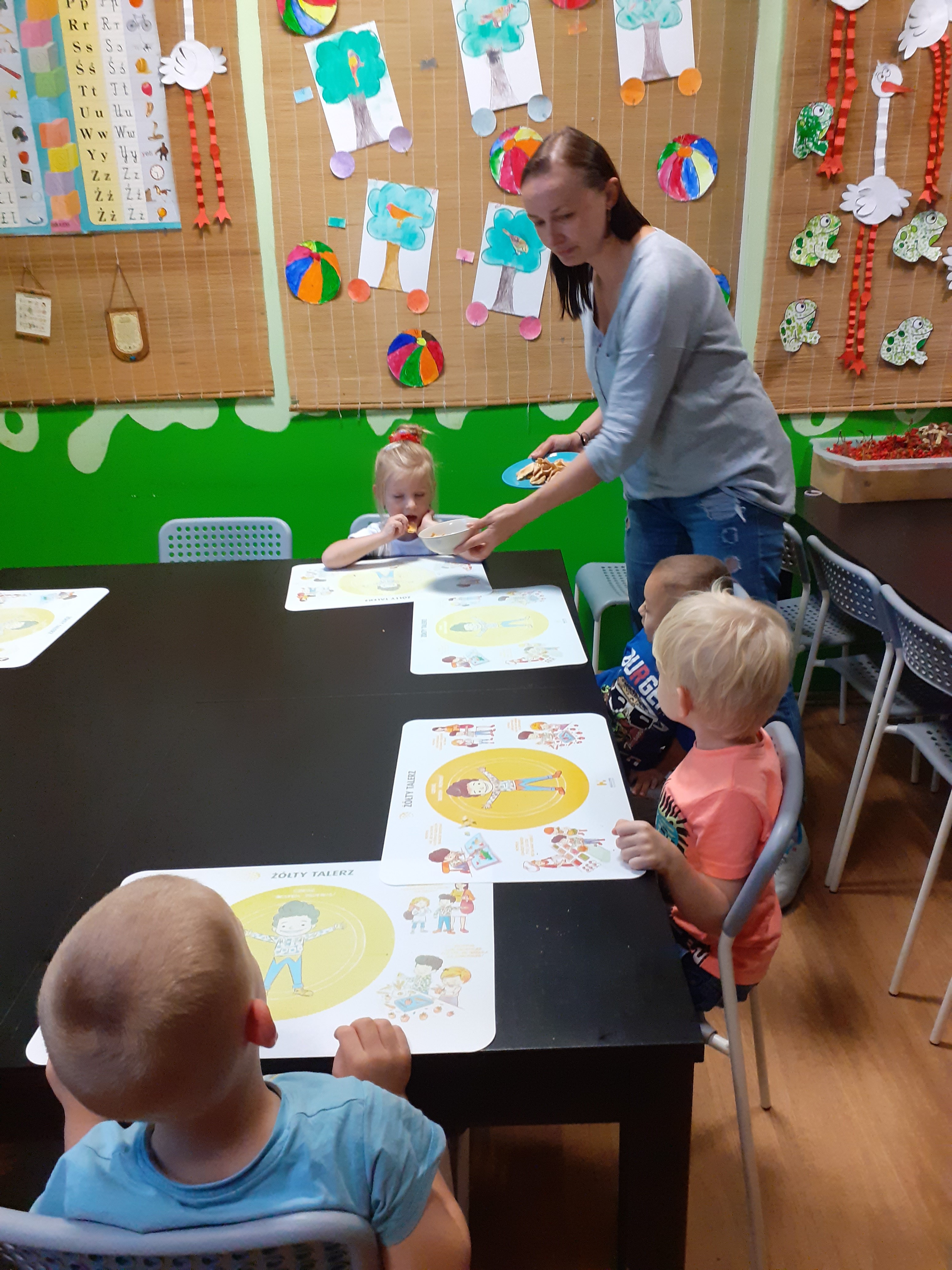 - Przy stole siedzą dzieci, kobieta rozkłada na stole miseczki oraz talerze z suszonymi jabłkami.