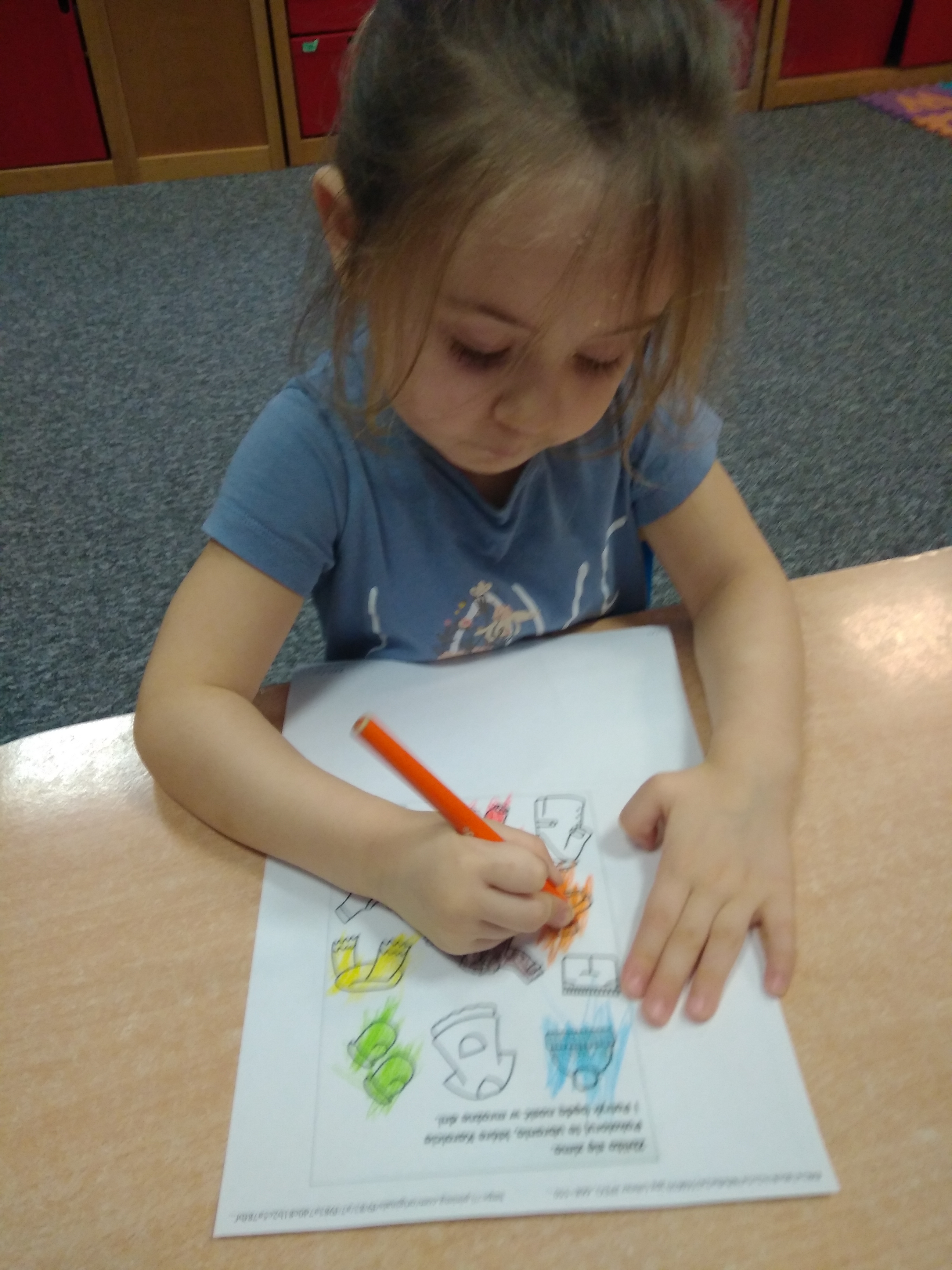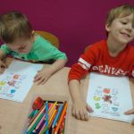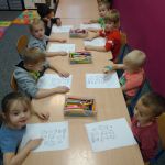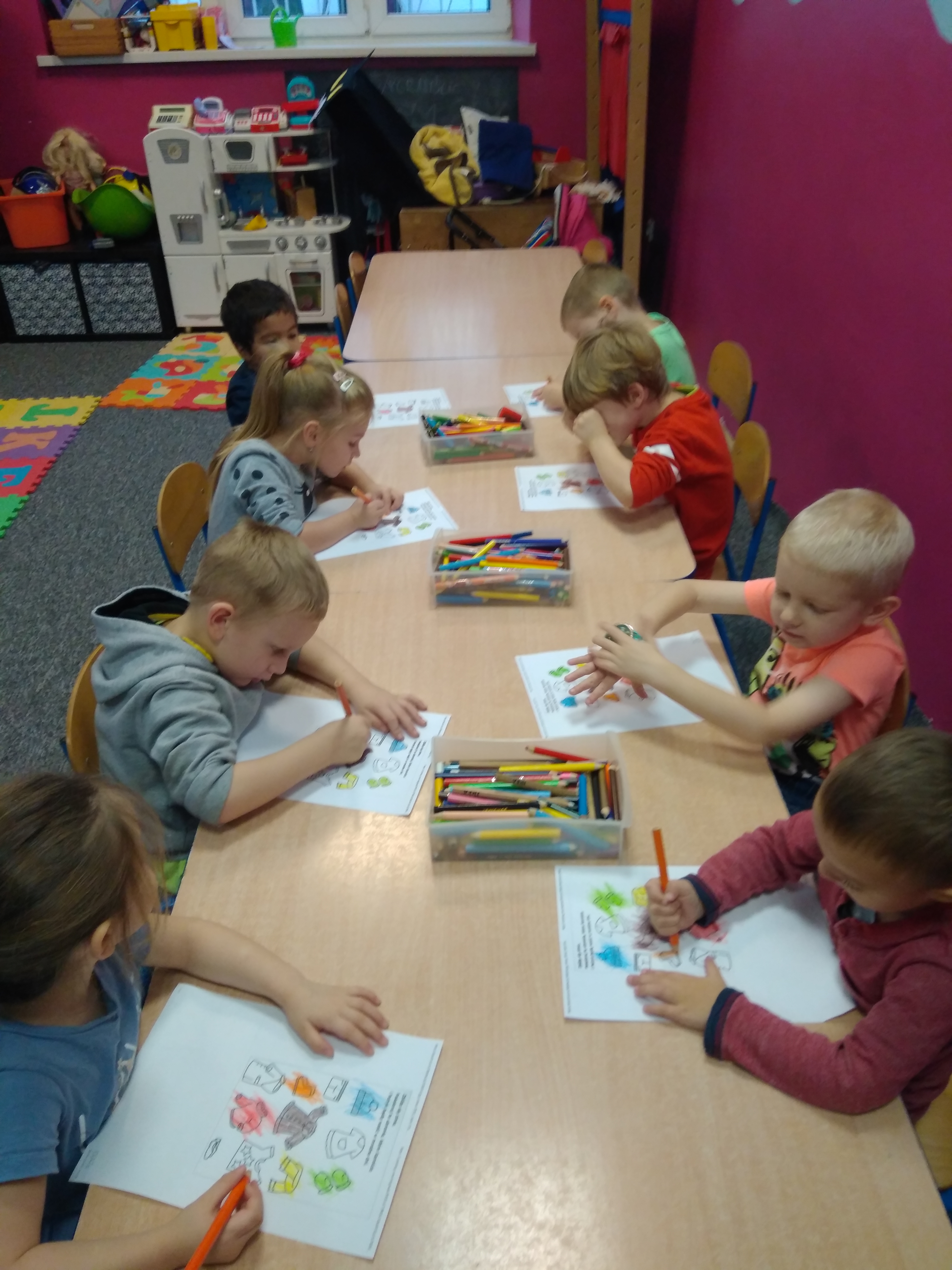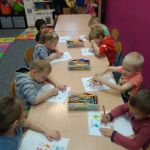 - Grupa dzieci siedzi przy stoliku i koloruje na kartkach.