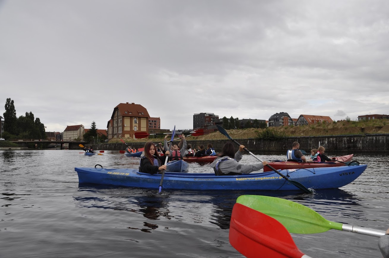 10 kajaków, deszcz i my. Pogoda nam nie była straszna i było super. Podczas pływania robiliśmy zdjęcia naszego pięknego miasta.