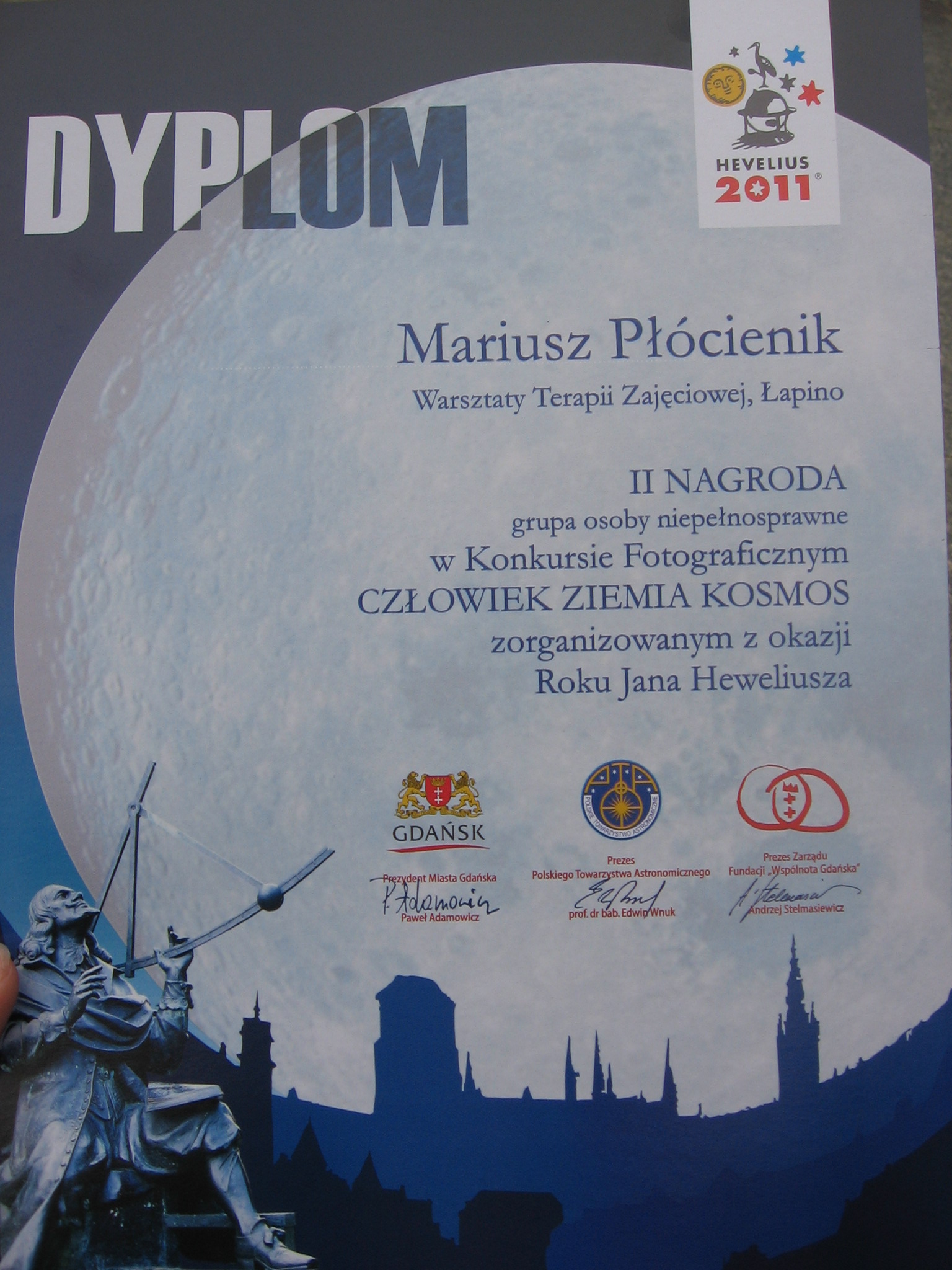 W miniony piątek uczestnik Warsztatu Terapii Zajęciowej w Łapinie, Pan Mariusz, odebrał nagrodę za zajęcie II miejsca w Konkursie Człowiek – Ziemia – Kosmos. Organizatorem konkursu była Fundacja Wspólnota Gdańska.