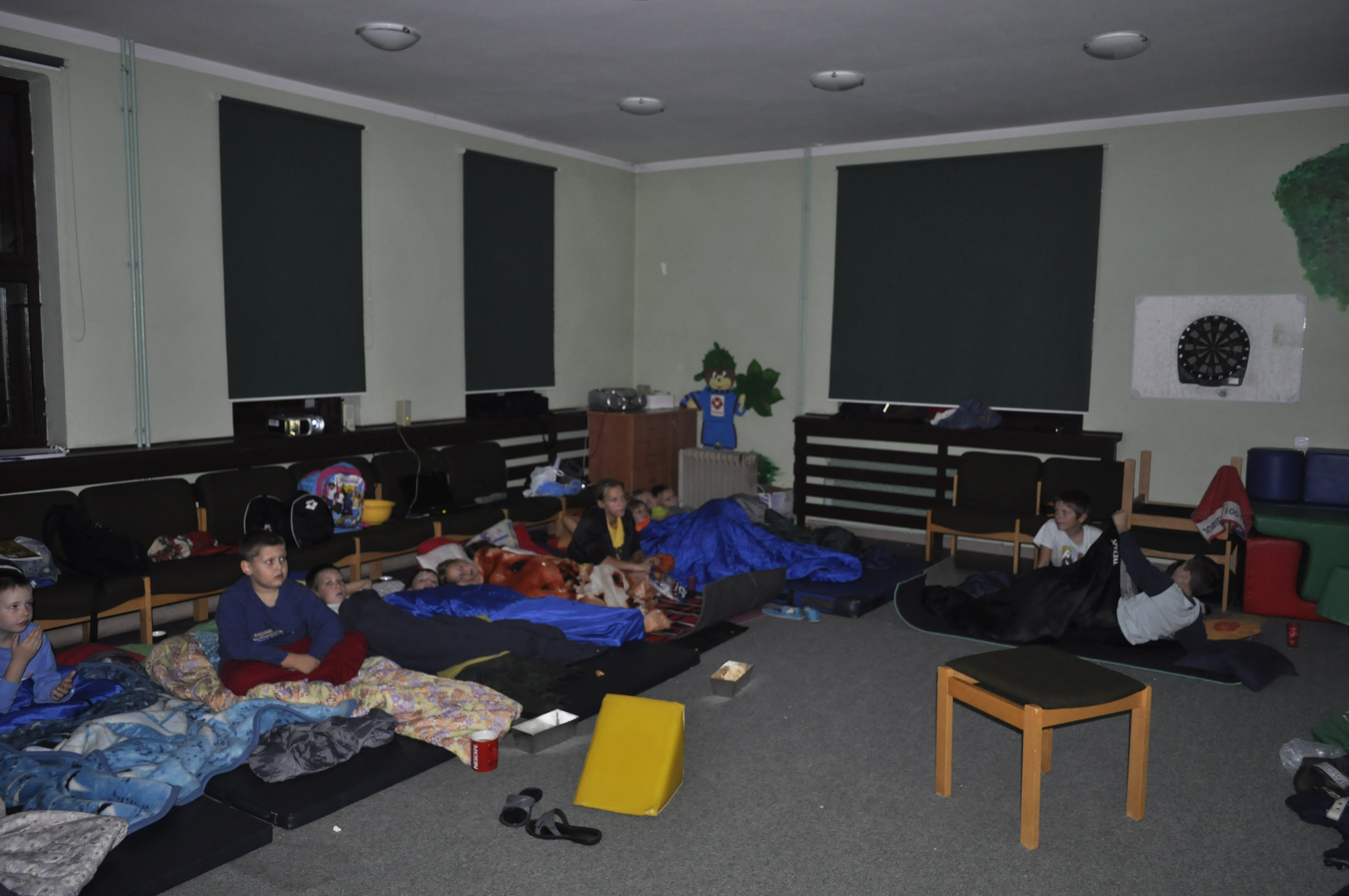 „Kota nie ma myszy harcują” tak można by podsumować wrzesień w Świetlicy „Pod Kasztanem”. Ciocia Ola na urlopie, a dowodzenie przejęła ciocia Agnieszka i ciocia Natalia. Nowy rok szkolny, nowe plany pracy świetlicy układane wspólnie z dziećmi. Czym by tu zaskoczyć ciocię Olę jak wróci z urlopu??? Otóż pomysłów jest wiele ale czy wszystkie spotkają się z aprobatą naszej szefowej??? No – ale podobno nieobecni nie mają racji … czy jakoś tak. W ten oto sposób powstał kalendarz imprez świetlicowych. Jedna z nich już za nami, a było to nocowanie w świetlicy, połączone z wieczorem filmowym. Tego dnia świetlica była czynna od godziny 18:00. Dzieci, które potrzebowały pomocy w lekcjach mogły przyjąć wcześniej i odrobić pracę domową. Schodziliśmy się sukcesywnie i mieliśmy trochę czasu na gry i zabawy w swoim gronie. Następnie była wspólna kolacja, a potem moszczenie gniazdek i nie chodzi tu o kontakty :). Gdy każdy miał już swoje „śpiworkowe gniazdko” zaczęliśmy wybierać filmy … a nie było to łatwe!!! Należało bowiem uwzględnić różnice w wieku i wypośrodkować między bajkami, a horrorami. Kolejny raz okazało się, że najlepiej się spisują w tej roli filmy animowane … niby dla dzieci, niby bajeczki ale jak się dobrze zagłębić w treść to okazuje się, że mamy drugie, trzecie, czwarte, piąte dno … a jednak zawsze dobrze się kończą. Oglądaliśmy nie tylko bajki … Horton słyszy Ktosia, I Ty możesz zostać bohaterem, Managaskar, 2012 (ale to jak już młodsza ekipa spała :). Filmowa noc zakończyła się w sobotę o godzinie 11:00. Zanim rozeszliśmy się do domów należało po sobie posprzątać i przygotować wspólne śniadanie. Chyba nie było tak źle choć ciocie jak zawsze miały do nas kilka uwag. Ale pewnie uda nam się powtórzyć nocny kasztanowy maraton filmowy 🙂