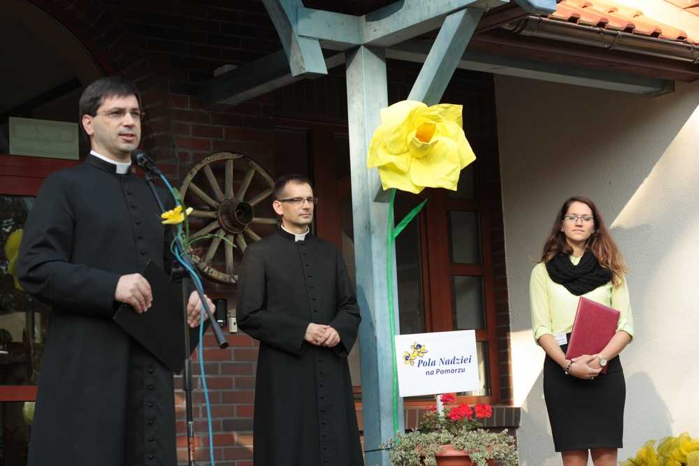 Dziś  4 października 2014 zainaugurowaliśmy Pola Nadziei na Pomorzu 2015. Uroczyste sadzenie żonkili i przekazanie sadzonek miało miejsce na terenie Domu Hospicyjnego Caritas im. św. Józefa w Sopocie. To radosne spotkanie środowisk hospicyjnych Pomorza przy licznym udziale wolontariuszy zgromadziło również wiele życzliwych nam osób. W wydarzeniu uczestniczyli Pani Hanna Zych-Cisoń Wicemarszałek Województwa Pomorskiego, Pan Wieczesław Augustyniak Przewodniczący Rady Miasta Sopotu, Pani Halina Lewkowska Wice Prezes Zarządu Fundacji Energa, Pani Alicja Stolarczyk Prezes Zarządu Fundacji Hospicyjnej – Hospicjum im. ks. Eugeniusza Dudkiewicza w Gdańsku, Pani Justyna Cyman reprezentująca Stowarzyszenie Hospicjum im. św. Wawrzyńca, Pani Agnieszka Lipińska z Hospicjum im. św. Ojca Pio w Pucku , Pani Stanisława Domaszkiewicz Prezes Stowarzyszenia Hospicjum im. św. Faustyny w Sopocie, Pan Mirosław Skwara reprezentant Rady Hospicyjnej Domu Hospicyjnego Caritas im. św. Józefa. Gościliśmy również reprezentację harcerzy z różnych gdańskich  hufców wraz z harcmistrzynią Anną Deptułą  z-cą Komendantki  Komendy Głównej Chorągwi  Gdańska  oraz podopiecznych Ośrodka Rehabilitacyjno Edukacyjno Wychowawczego w Trąbkach Wielkich.