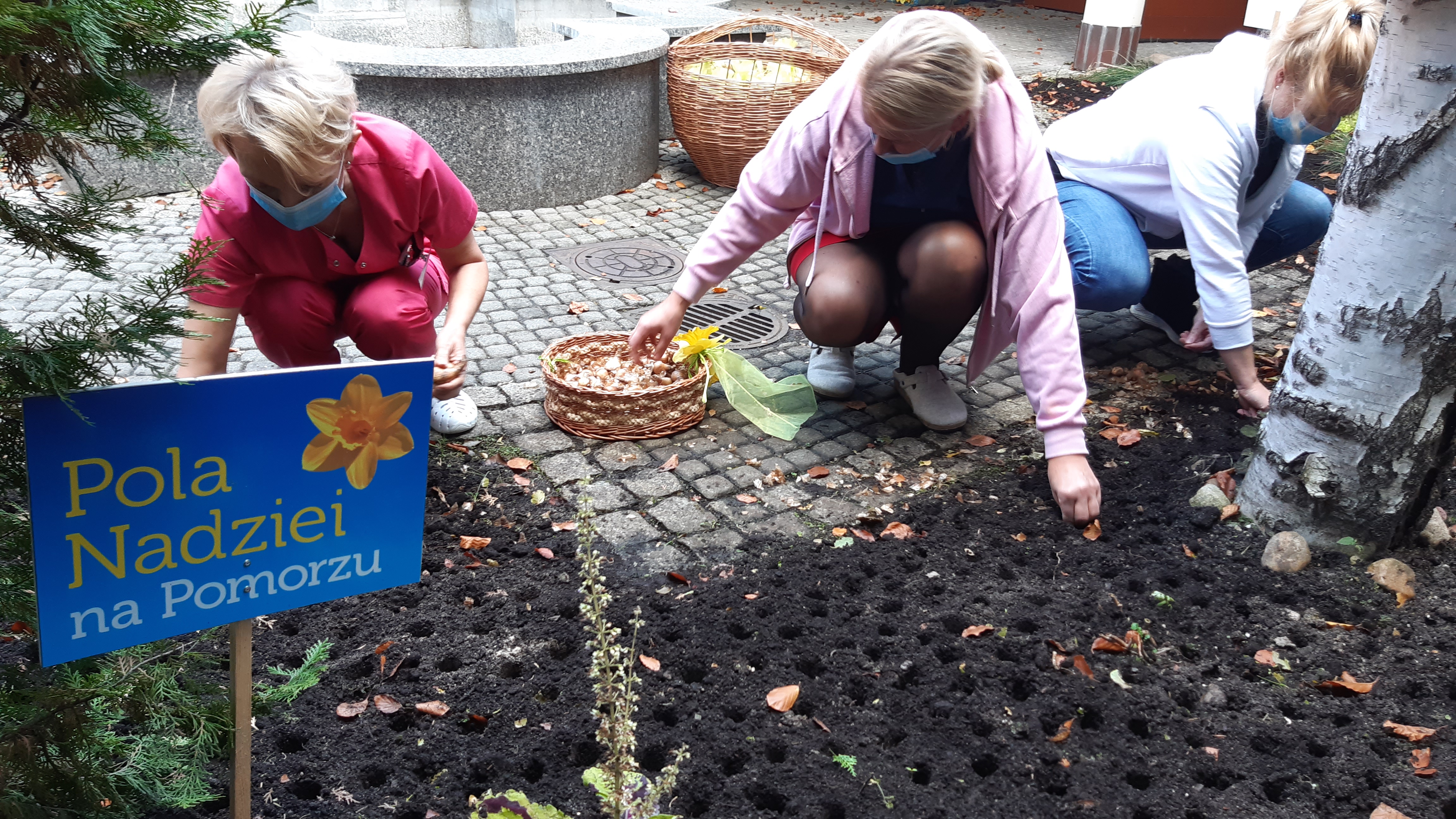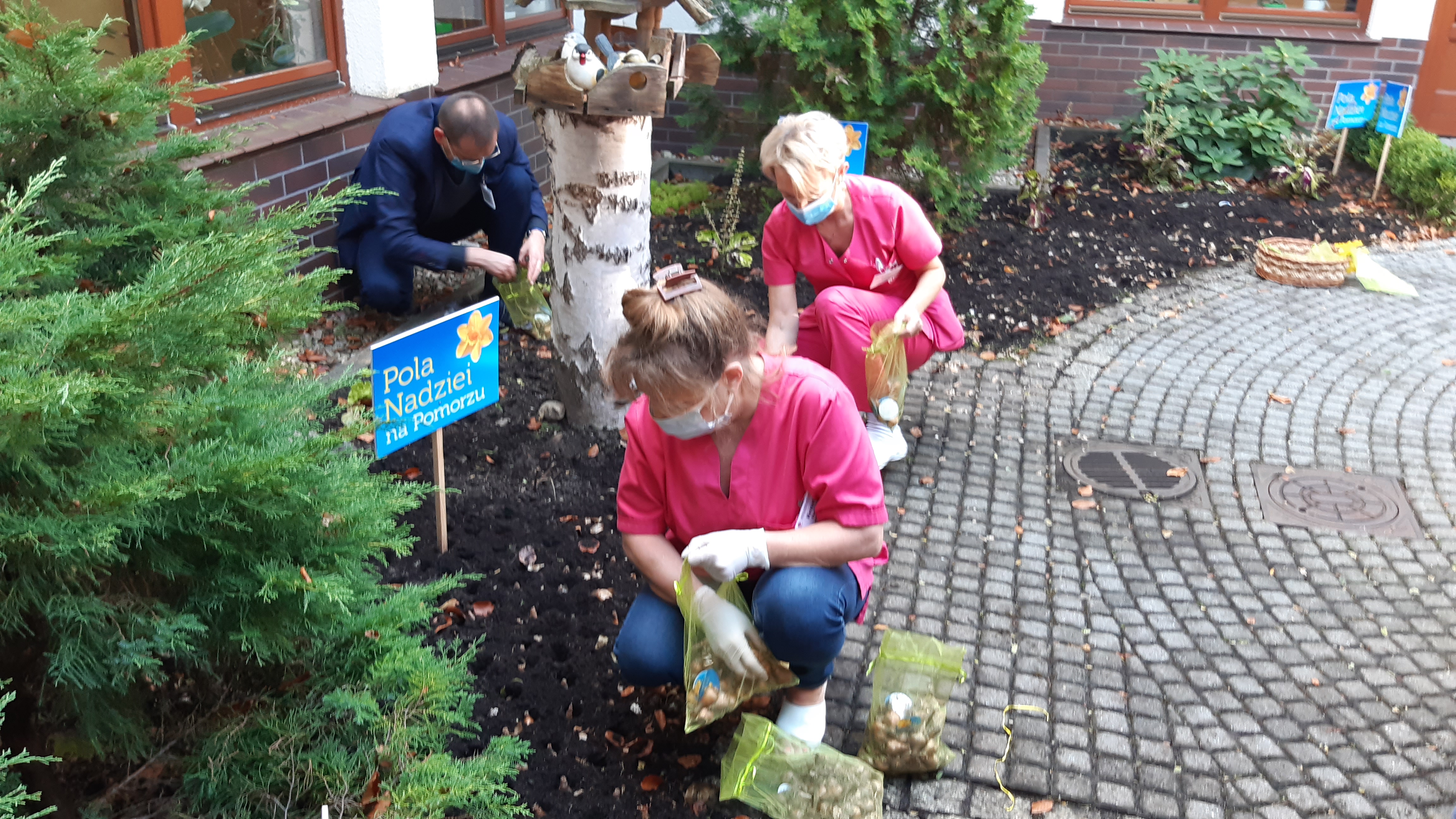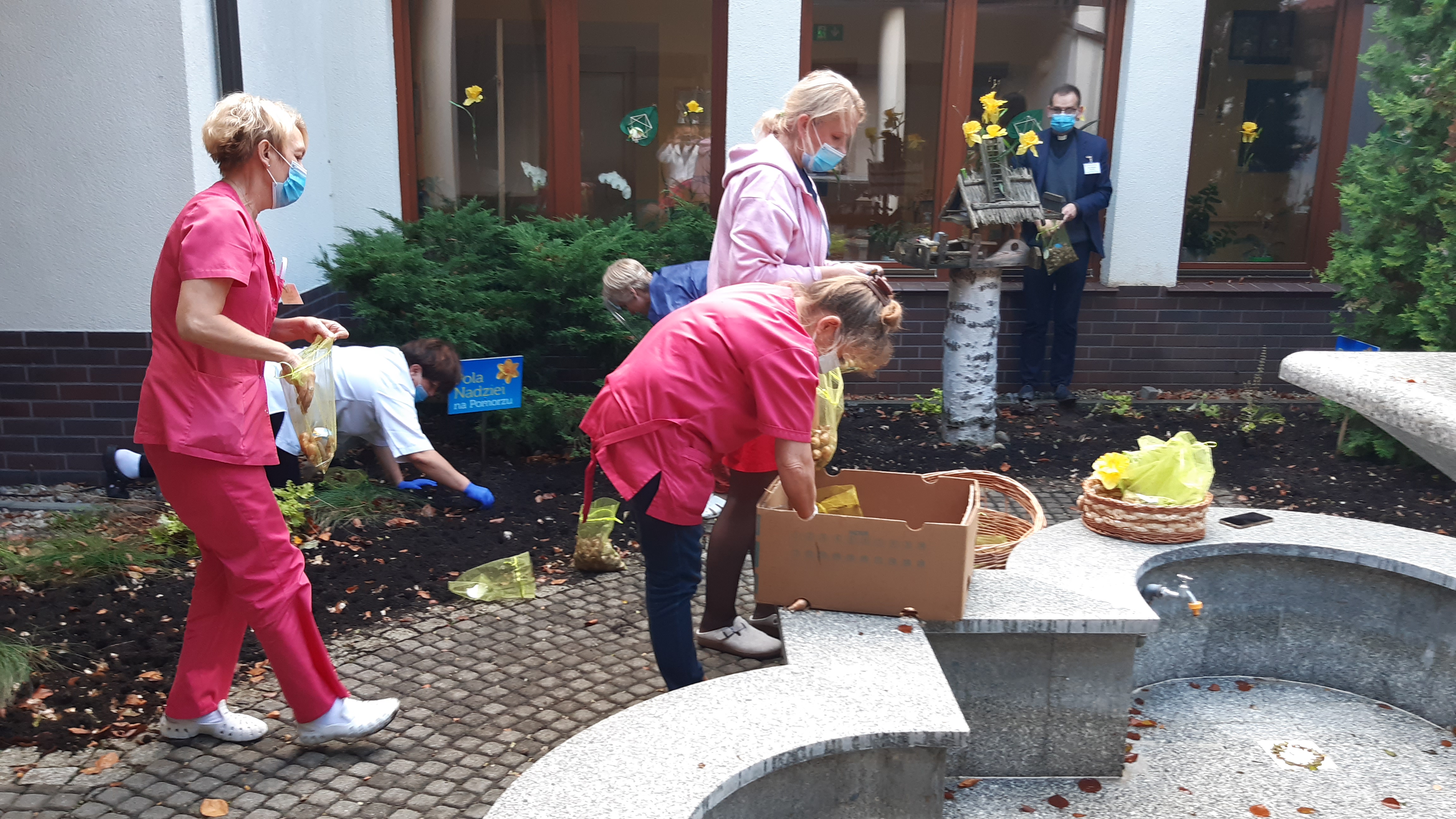 . To dłonie naszego personelu, które codziennie służą Siostrom i Braciom cierpiącym przynosząc Im ulgę, pociechę, wsparcie, pocieszenie i oparcie. Ta chwila dała nam wiele radości i satysfakcji. Miejscem wzrastania żonkili będzie nasze hospicyjne patio – urokliwy i subtelny zakątek. Wytrwale i entuzjastycznie dopingowali nas z okien pierwszego piętra Kochani Podopieczni. Niech rosną i zakwitną na wspólny finał Pól Nadziei na Pomorzu, który mamy nadzieje wspólnie przeżywać 25 kwietnia 2021 roku.