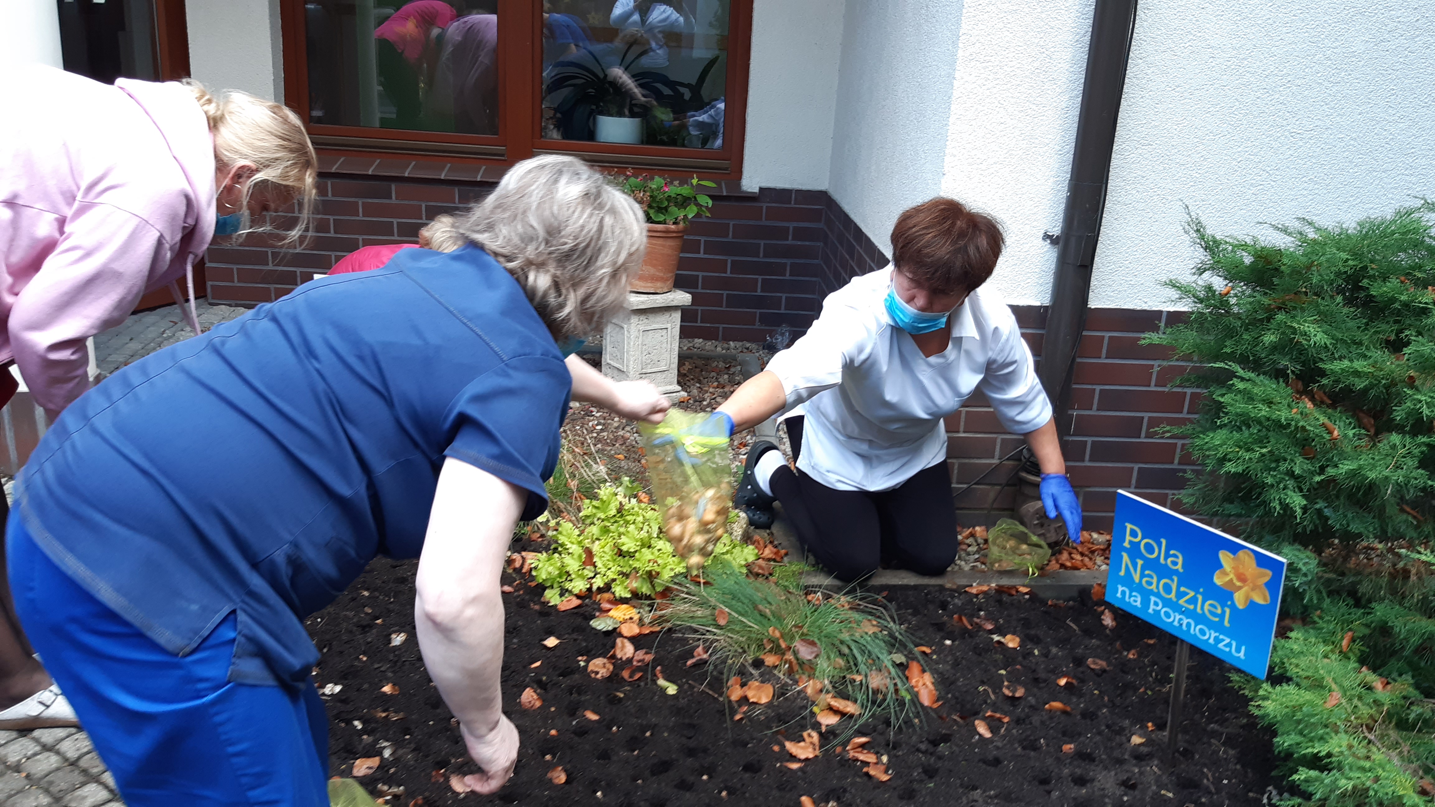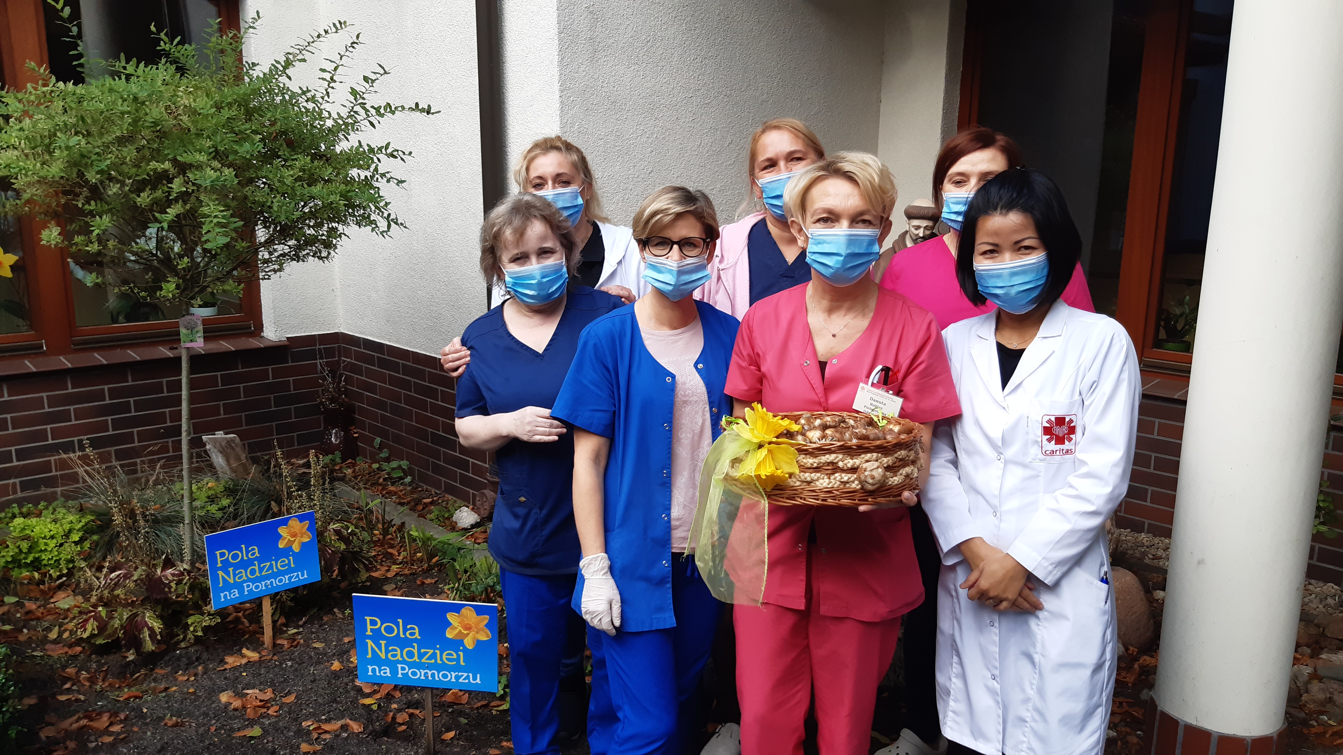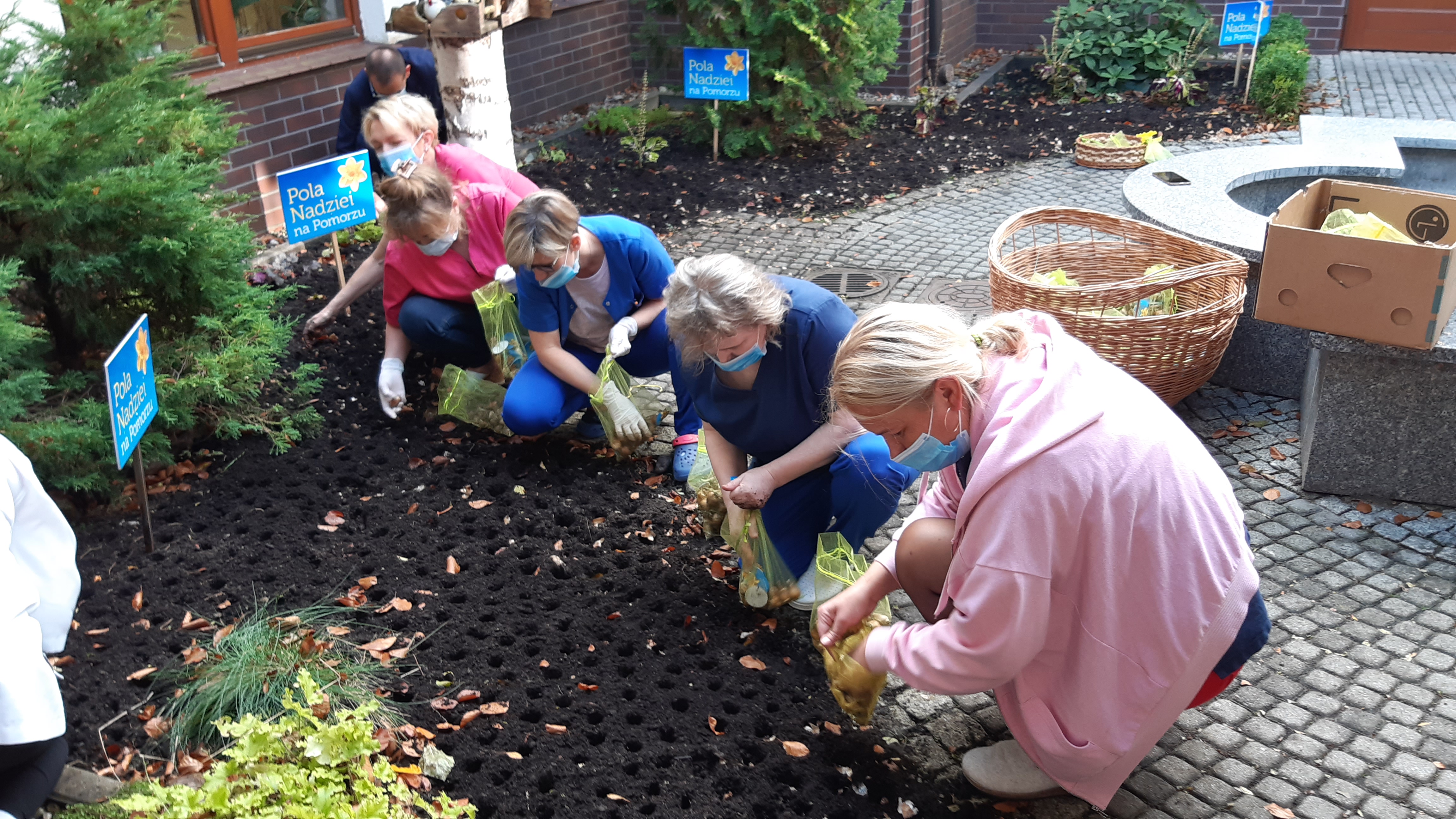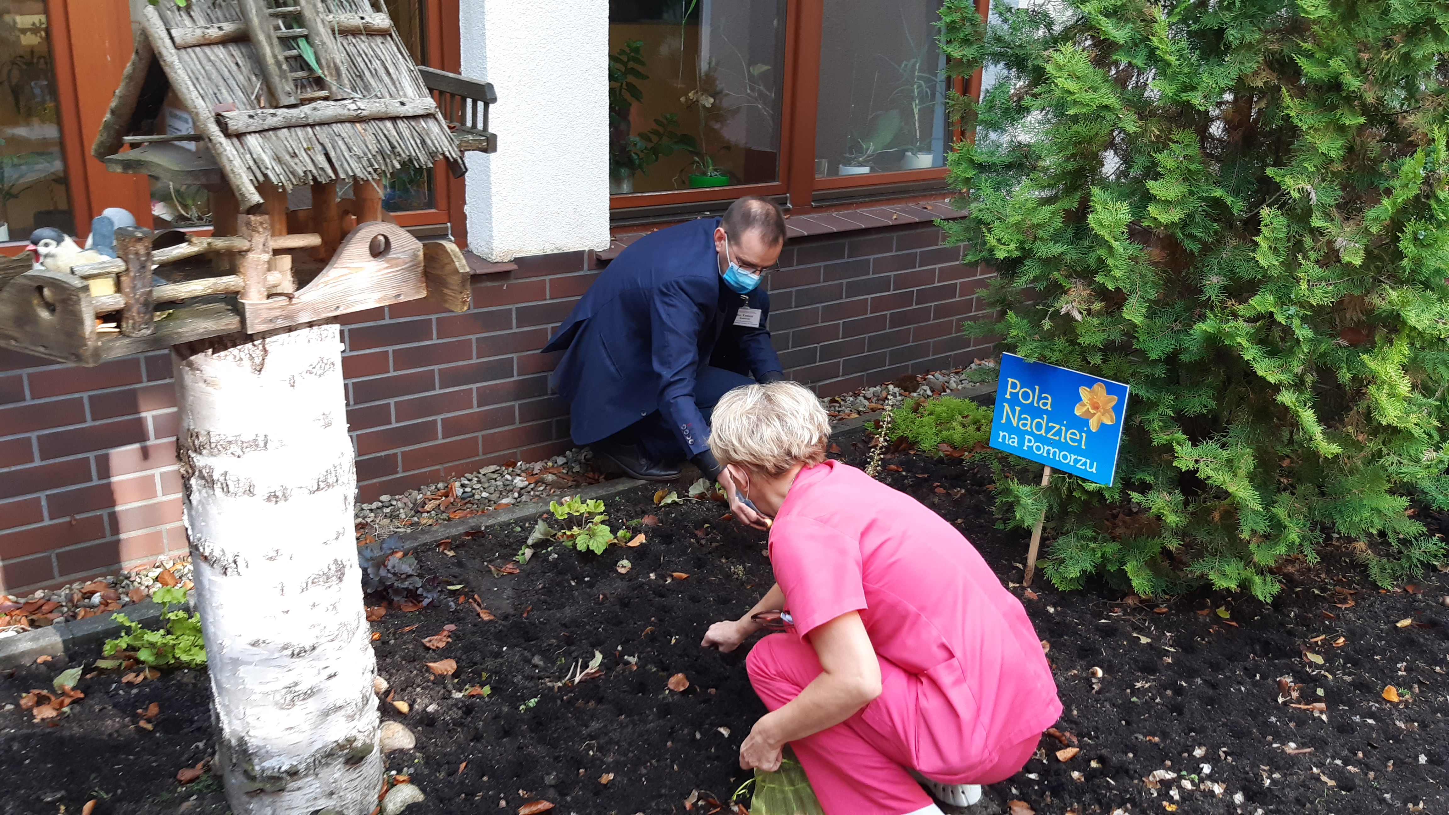 . To dłonie naszego personelu, które codziennie służą Siostrom i Braciom cierpiącym przynosząc Im ulgę, pociechę, wsparcie, pocieszenie i oparcie. Ta chwila dała nam wiele radości i satysfakcji. Miejscem wzrastania żonkili będzie nasze hospicyjne patio – urokliwy i subtelny zakątek. Wytrwale i entuzjastycznie dopingowali nas z okien pierwszego piętra Kochani Podopieczni. Niech rosną i zakwitną na wspólny finał Pól Nadziei na Pomorzu, który mamy nadzieje wspólnie przeżywać 25 kwietnia 2021 roku.