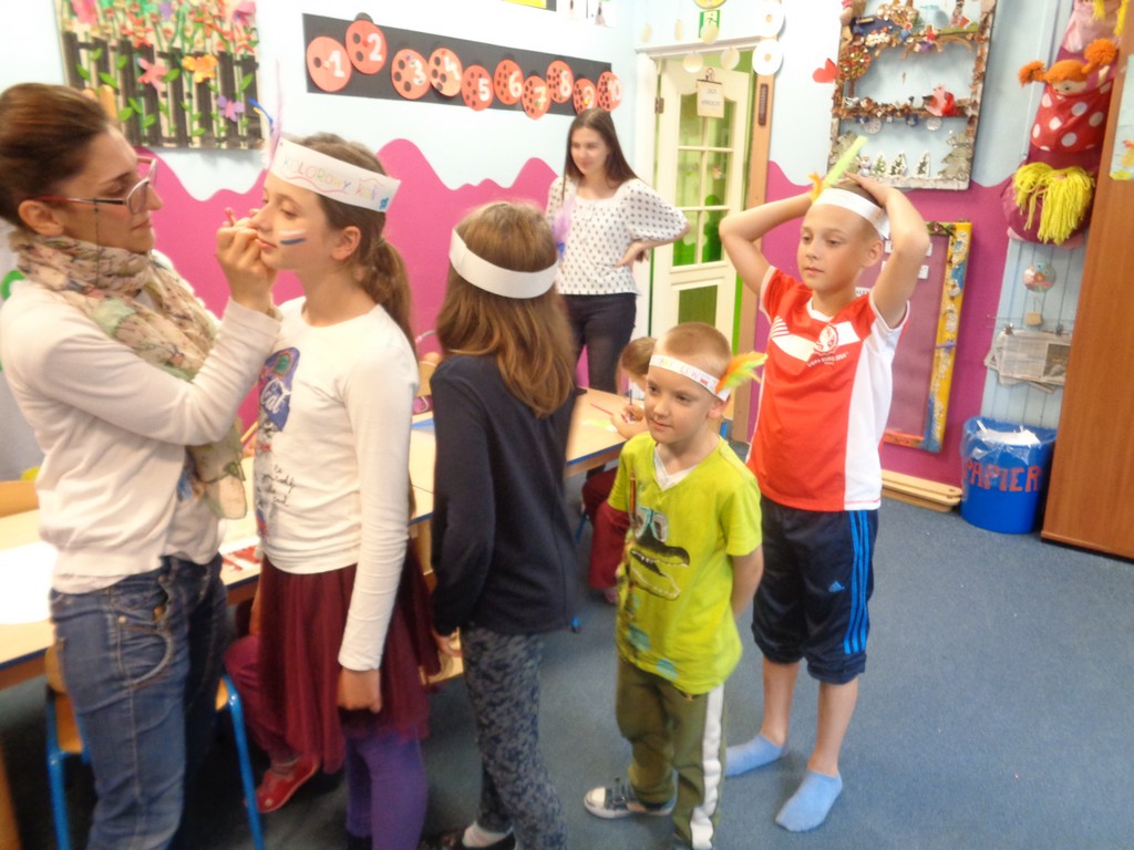 Grupa „Anielska Kraina” przeobraziła się w Indian. Każde dziecko z nowo nadanym imieniem i pióropuszen na głowie próbowało swoich sił jako myśliwy oraz ćwiczyło miejętności skradania się. Nie brakowało indiańskich okrzyków, wojennych barw i zbudowanej wspólnymi siłami wioski.