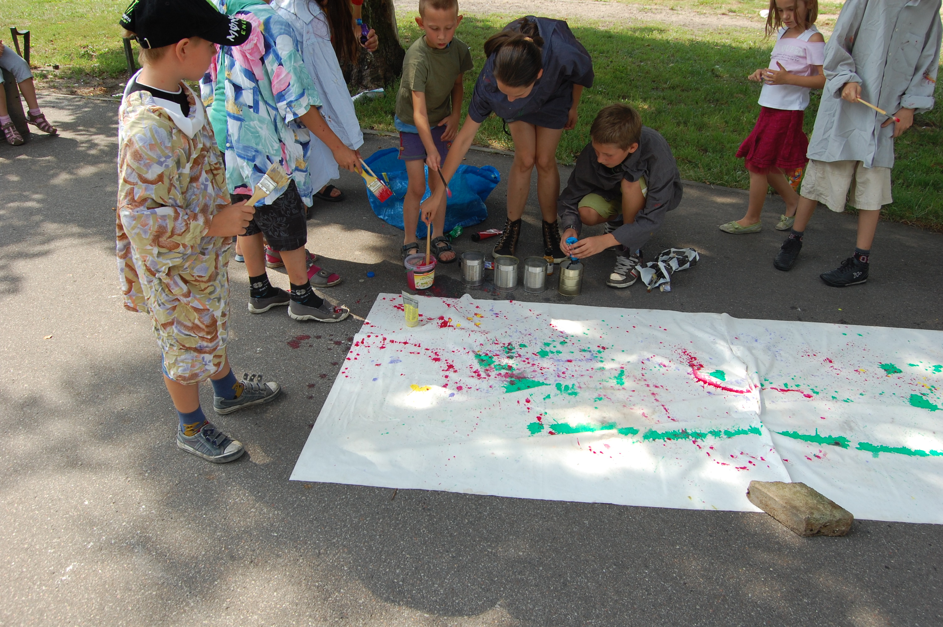 Jackson Pollock „Na Dolnej”. We wtorek „odwiedził” nas kolejny wielki artysta współczesnej sztuki. Tym razem stworzyliśmy wielkie płótno ze starych obrusów. Wykorzystaliśmy również zużyte farby akrylowe. Napełniliśmy je ciepłą wodą, ubraliśmy koszule do malowania i zaczeliśmy tworzyć. Plamami, kropkami, liniami, kleksami stworzyliśmy sztukę.