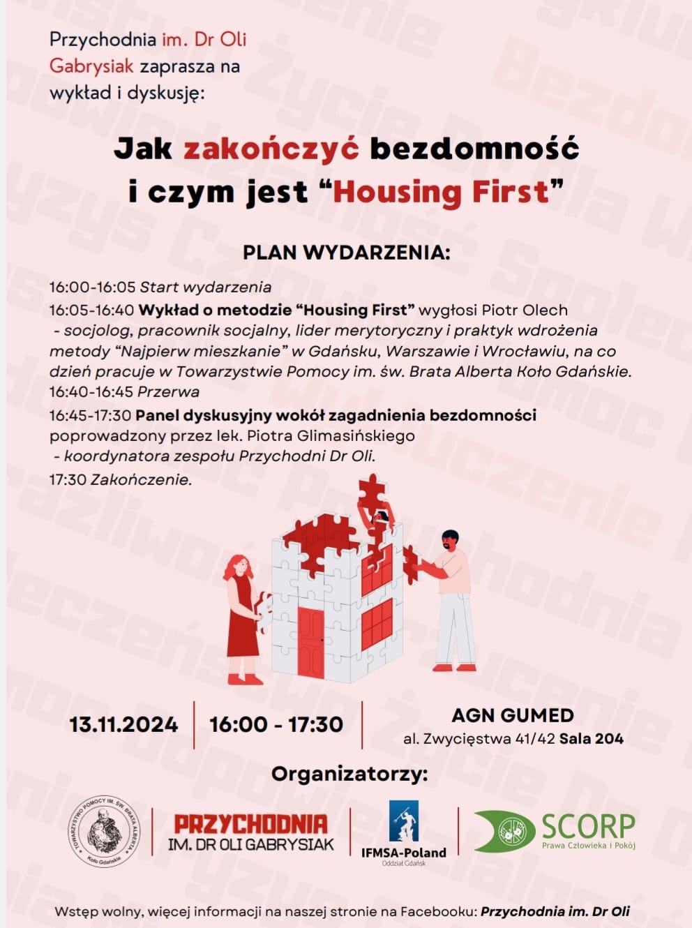 Jako lekarze, pielęgniarki, ratownicy medyczni i studenci medycyny, codziennie spotykamy osoby w kryzysie bezdomności – na oddziałach ratunkowych, w szpitalach, placówkach psychiatrycznych i w trakcie wizyt realizowanych w ramach Zespołów Ratownictwa Medycznego. Bardzo często są to te same osoby, które mimo naszych największych wysiłków wracają do nas. Wówczas rodzi się pytanie – czy tak musi być? – mówi koordynatro zespołu Piotr Glimasiński. O metodzie „Housing First” w swoim wykładzie opowie socjolog, pracownik socjalny, lider merytoryczny i praktyk