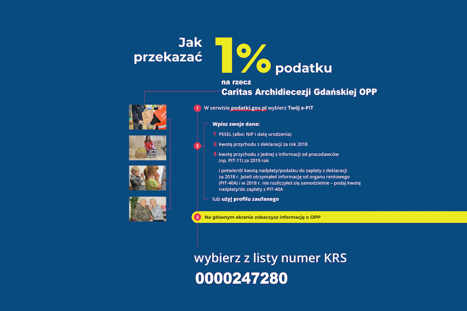 Zbliża się końcowy termin składania PIT–ów. W tym roku upływa on w poniedziałek, 1 czerwca. Zachęcamy do przekazania 1 % podatku na rzecz Caritas Archidiecezji Gdańskiej OPP. Przekazujemy dokładną instrukcję jak to zrobić.
