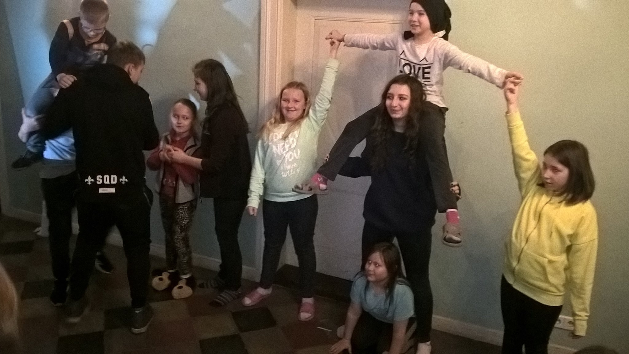Wtorek spędziliśmy bardzo aktywnie – mogliśmy wyskakać swoją energię w Parku Trampolin „No Gravity”. Takiej dawki sportowych wrażeń było nam potrzeba! Uśmiechy nie schodziły nam z twarzy do końca dnia. Po takich szaleństwach na trampolinach przyszedł czas na odrobinę relaksu w świetlicy. Była to okazja do wspólnej zabawy i niekończących się rozmów. Nie mogło zabraknąć zabaw z chustą animacyjną, w które zawsze chętnie się angażujemy! Było gonienie kolorów, zgadywanie imion i wiele innych konkurencji:) Okazało się, że przed nami jeszcze jedno wyzwanie – stworzenie dalszej części baśni o niezwykłym Krasnalu. Pamiętaliśmy także o ilustracji do tekstu. Jesteśmy zadowoleni z tego, co udało nam się stworzyć. Byliśmy też na lodowisku.