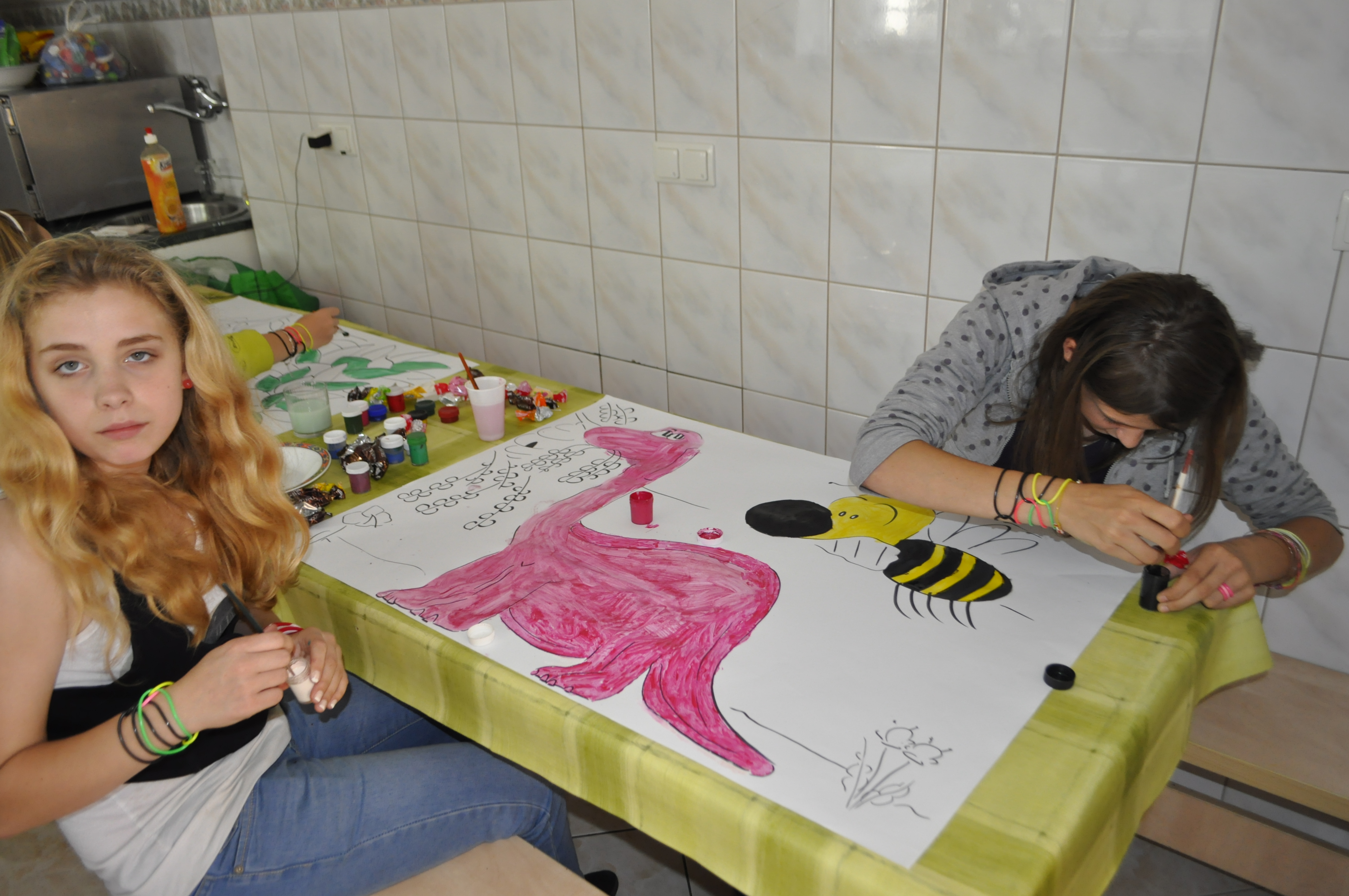 W czwartek pojechaliśmy do świetlicy Słoneczne Wzgórze. Na początku mogliśmy sami się zająć sobą i oczywiście Rummikub poszedł w ruch. Ciocia Sylwia podzieliła nas na grupy i losowaliśmy zadania. Mieliśmy do wylosowanych zwierząt wymyślić lub przypomnieć sobie piosenki na ich temat. I po długim czasie oczekiwania przyjechali młodzi ludzie, którzy poprowadzili dla nas fajne zajęcia. Pracownicy Fundacji Europejskiego Centrum Wspierania Inicjatyw Społecznych z Włocławka, którzy w ranach Programu „Pokoloruj Świat” przeprowadzili warsztaty edukacyjno – kulturalne. Każdy z nas dostał ogromną kolorowankę i malowaliśmy je farbami, pastelami. Pisaliśmy na podpalanym papierze to co chcieliśmy. Na koniec było karaoke…. Na zakończenie dostaliśmy dyplomy i upominki. Dziękujemy.