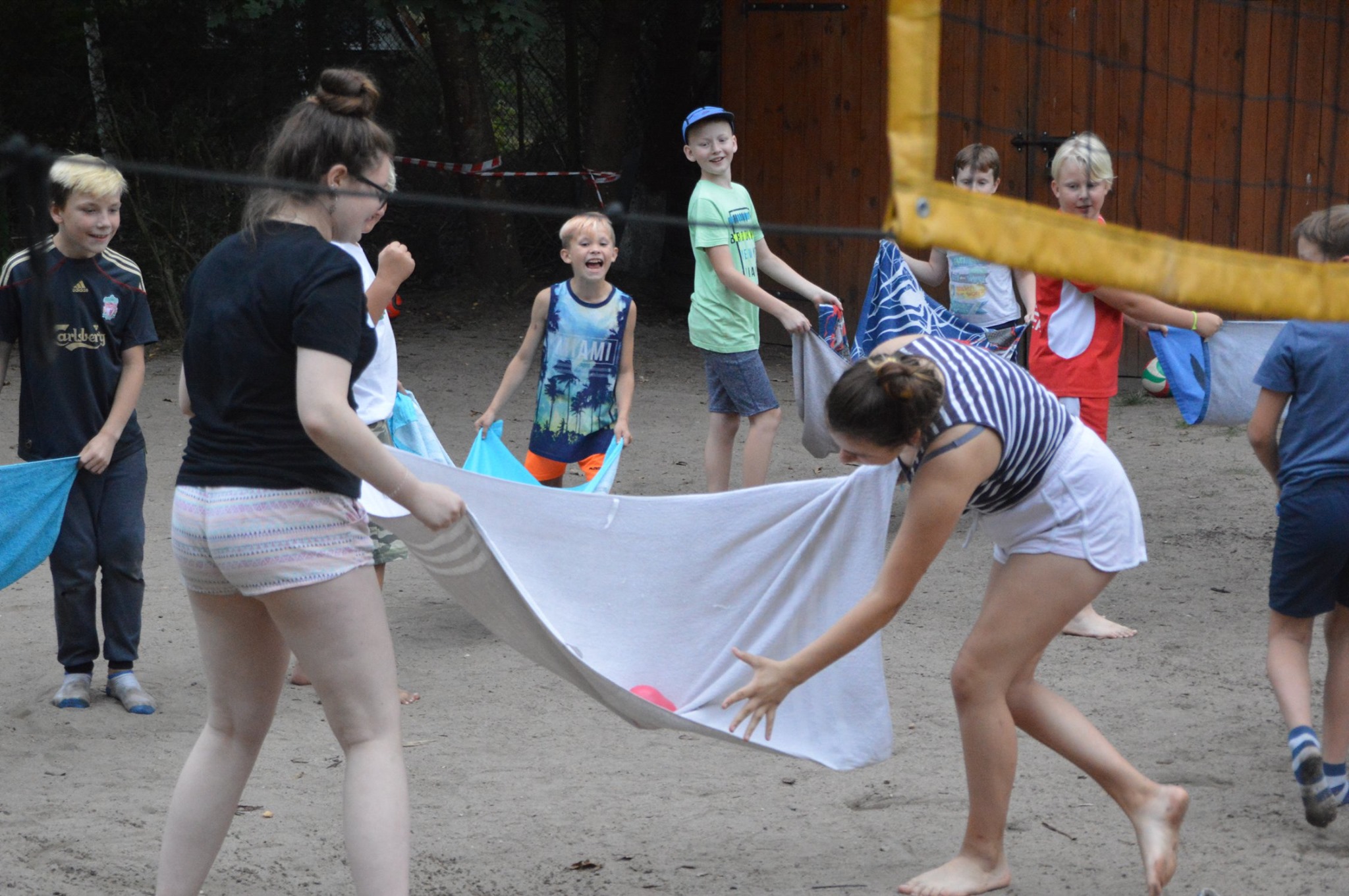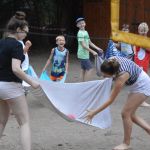 Drugi dzień okazał się równie intensywny. Tak naprawdę każdy dzień mieliśmy zaplanowany od rana do wieczora! Zaczęliśmy od basenu – największą popularnością cieszyła się największa zjeżdżalnia! Ale również jacuzzi i mniejsza zjeżdżalnia przyciągały zainteresowanych. Po obiedzie i krótkim odpoczynku zostaliśmy zabrani na leśne podchody. Szukaliśmy wskazówek, rozwiązywaliśmy zagadki. Dowiedzieliśmy się na przykład kilku bardzo ciekawych rekordów ze świata zwierząt, mieliśmy okazję sprawdzić umiejętność logicznego myślenia ale przede wszystkim tego, jak współpracujemy jako grupa. Nie zawiedliśmy i tym razem. Po południu, z racji tego, że pogoda nam dopisywała czekała nas balonowa siatkówka. To już nasza kolonijna tradycja. Zabawa była świetna – mnóstwo śmiechu i endorfin. Mało komu udało się pozostać suchym.