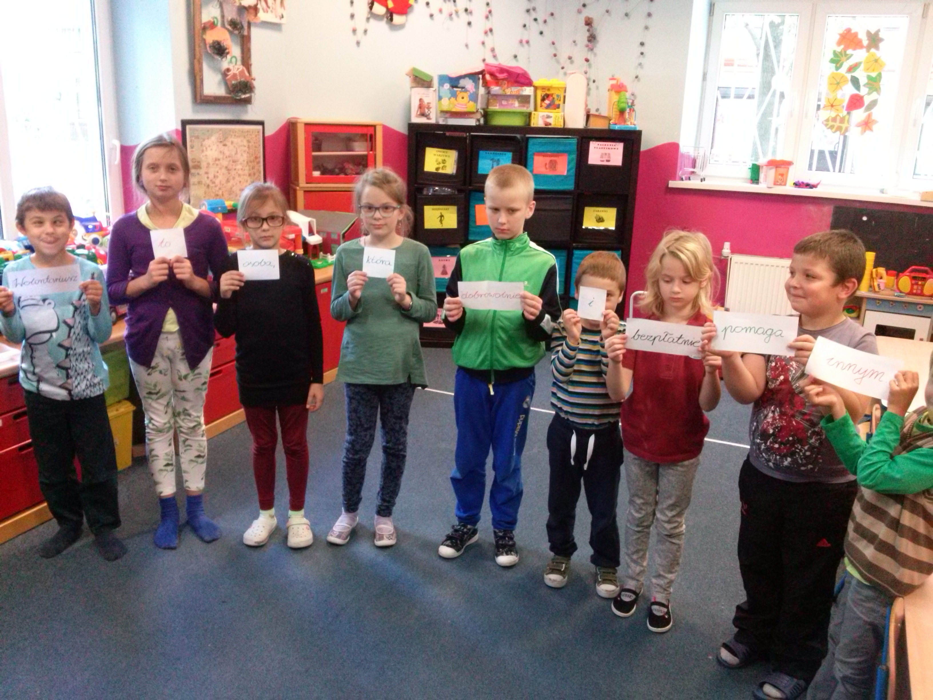 Dzieciaki z „Anielskiej Krainy” mają szczęście poznawać nowych wolontariuszy, którzy pomagają im w wykonywaniu prac domowych, a także towarzyszą w zabawach.W związku z tym przypominali sobie na zajęciach: Kto to jest wolontariusz? Jaki jest? Co robi? Wychowankowie uruchamiali nie tylko pamięć ale i twórczość własną.