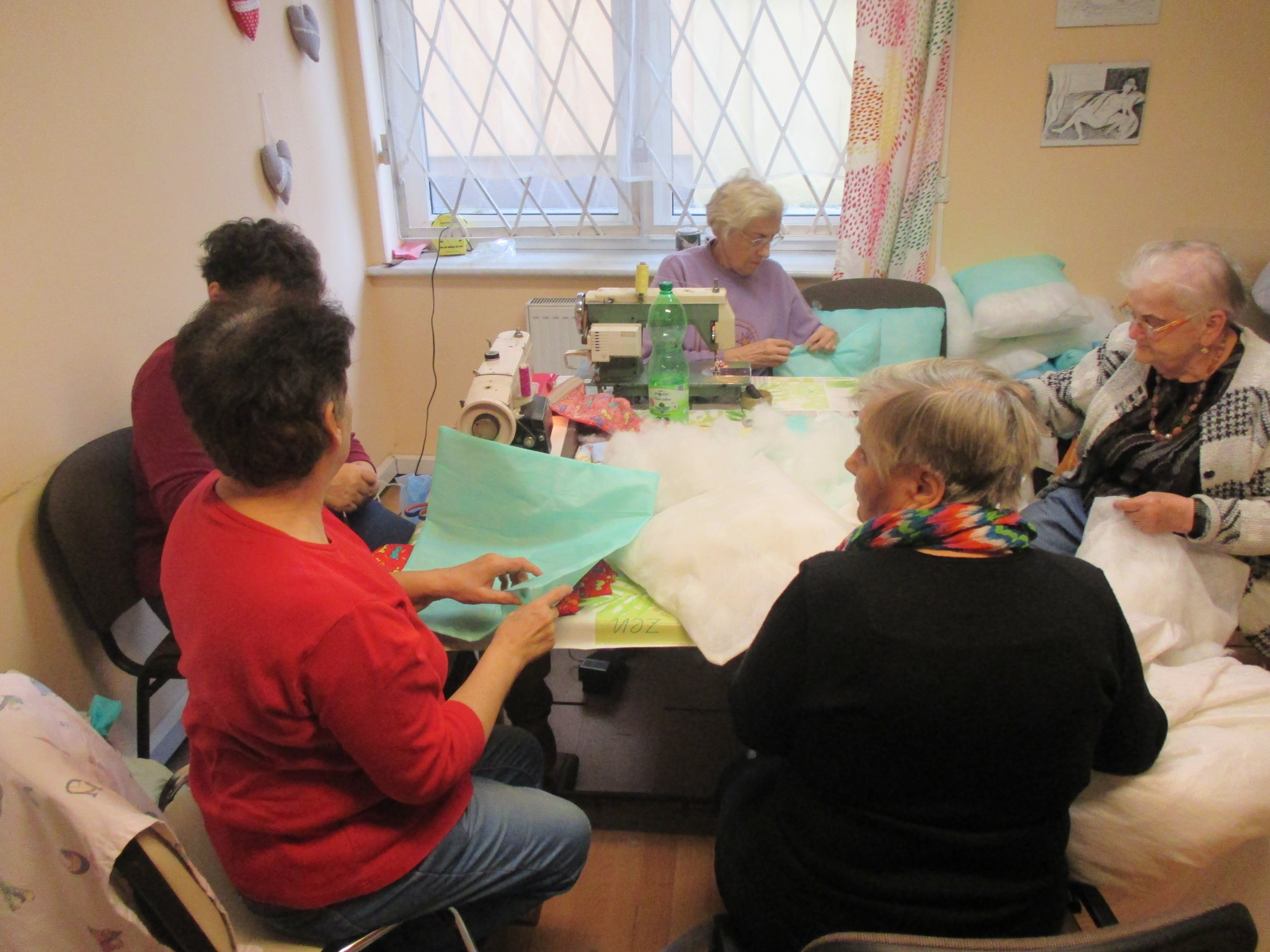 Panie Seniorki z Klubu Seniora „Młyniska” przy ul. Marynarki Polskiej 134A szyją poszewki, które przekażemy na cel akcji.