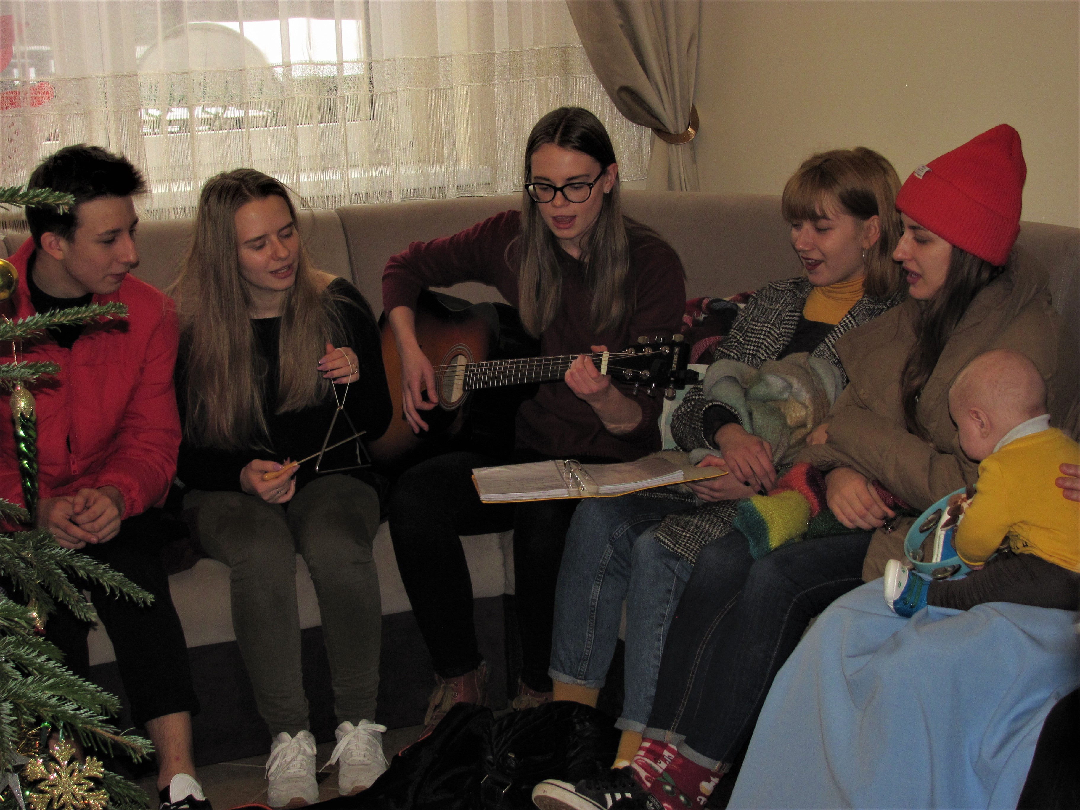Następnie młodzież z ks. Wiesławem poprowadziła kolędowanie. Razem z podopiecznymi Domu – matkami z dziećmi oraz siostrami zaśpiewali kilka popularnych kolęd przy akompaniamencie tamburynu, ukulele, gitary, trójkąta oraz klekotki.
