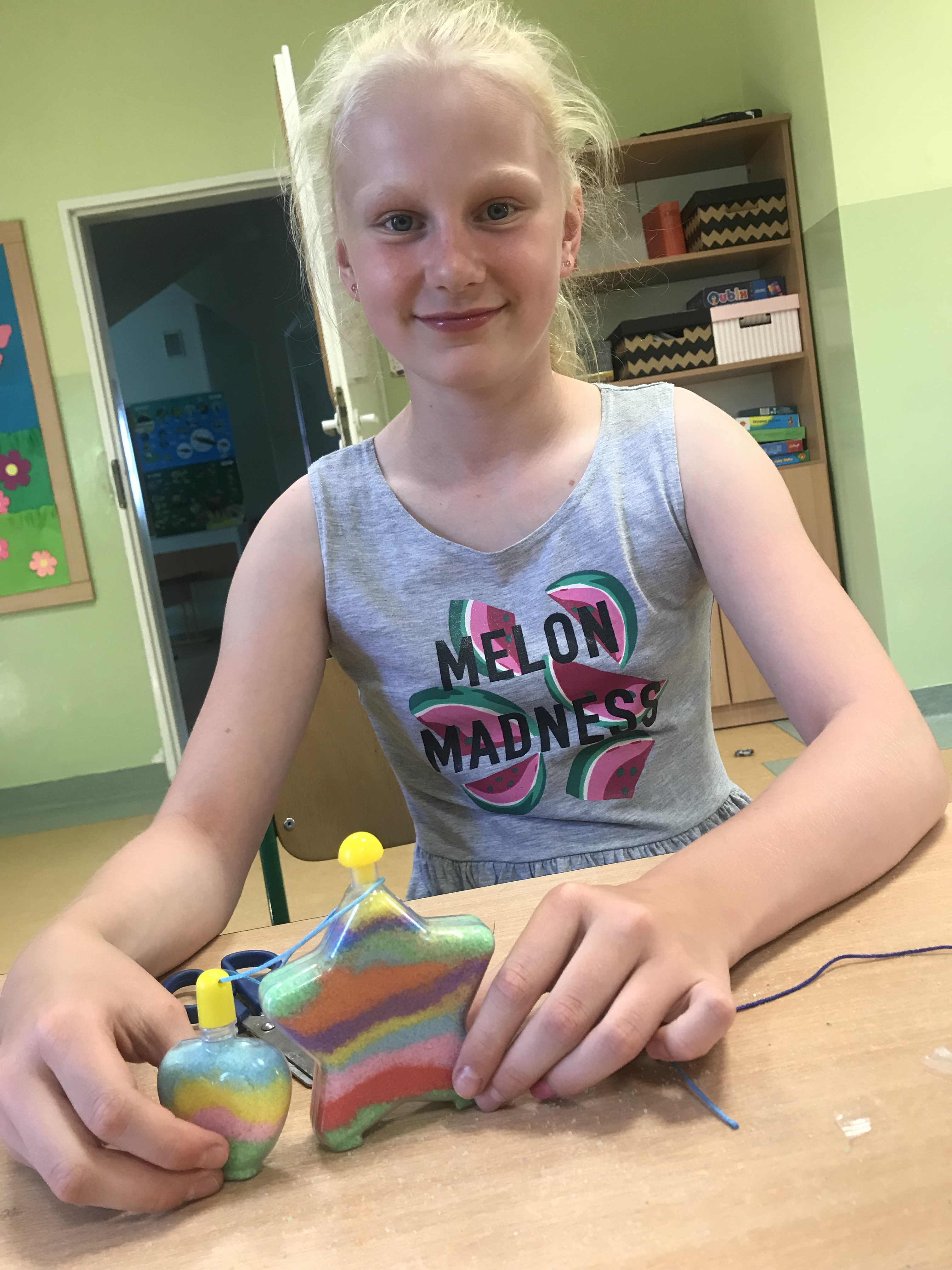 Pod koniec maja dzieci ze świetlicy w Borkowie świętowały Dzień Dziecka. Były lody, ale świetnym prezentem okazał się kolorowy piasek i buteleczki. Każdy mógł wybrać kształt butelki i wykonać z niej swoja ozdobe do pokoju. Największe wrażenie wywarł piasek, który świeci w ciemności.