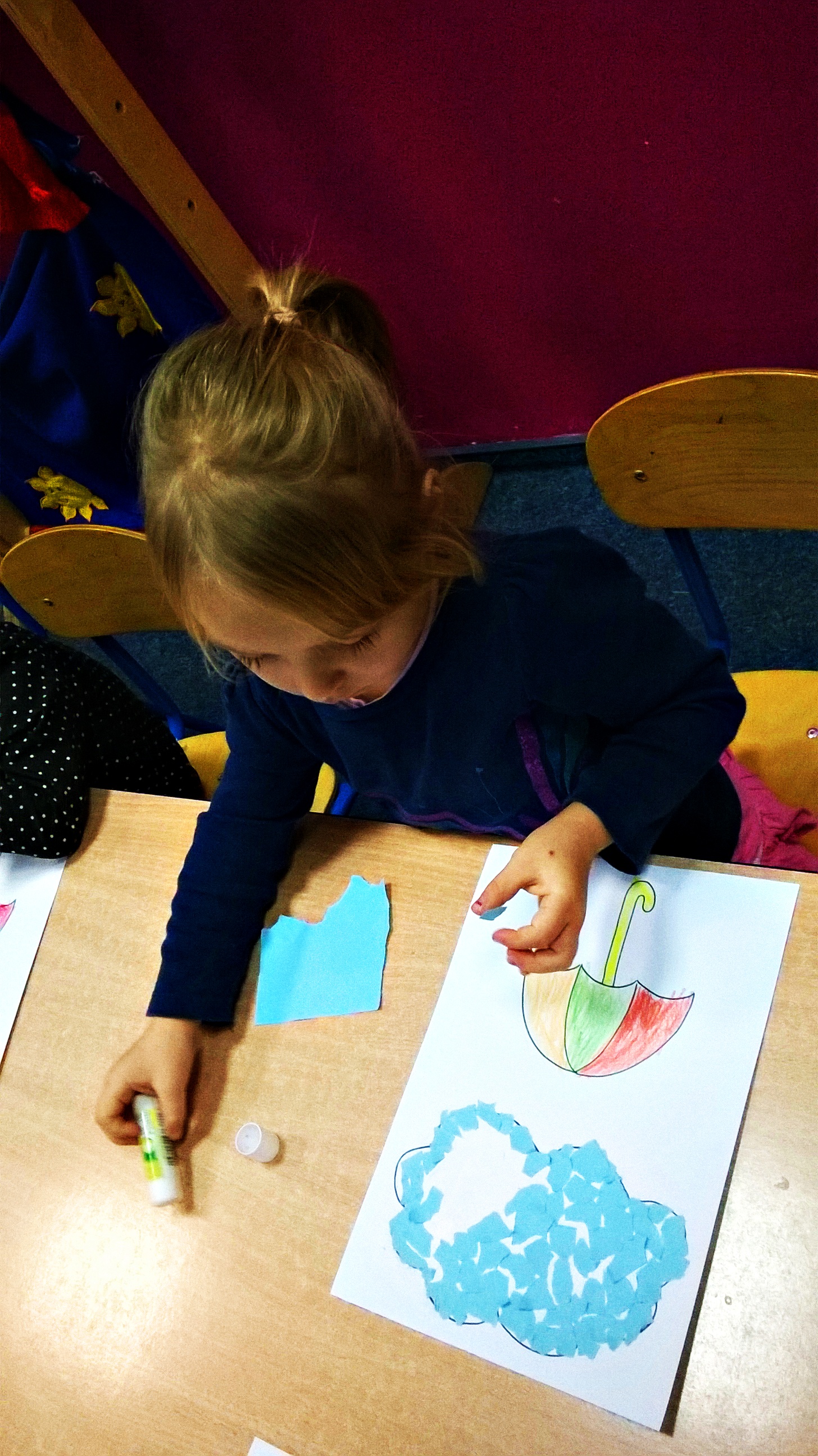 Nasze Krasnale, mimo szarości za oknem, próbują rozweselić jesienny czas. Przy pomocy rożnych technik: wydzieranki, kolorowanki oraz malowania paluszkami, maluchy stworzyły jesienne prace. Mimo padającego deszczu, parasol nie przestaje być kolorowy 🙂