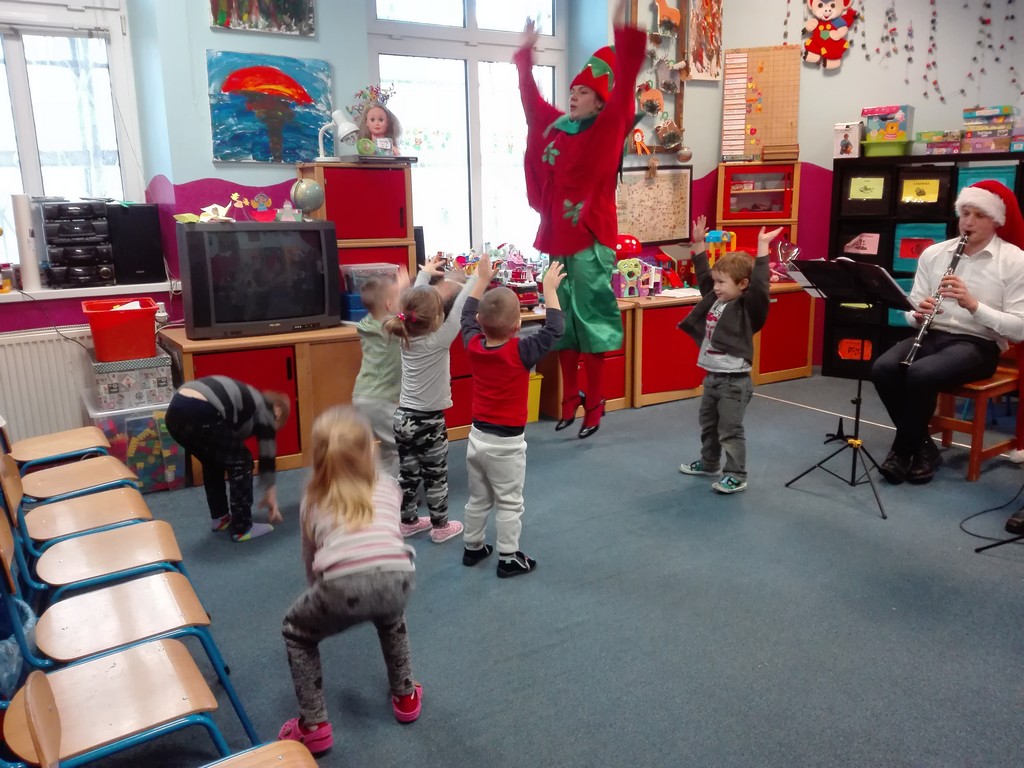 Na początku grudnia nasze maluchy z grupy „Radosne Krasnale” odwiedzili artyści z Agencji Artystycznej „Pro Musica” z koncertem pt. „Tajemnicze zniknięcie Świętego Mikołaja”. Muzycznej opowieści towarzyszyły instrumenty: saksofon, gitara elektryczna oraz śpiew.