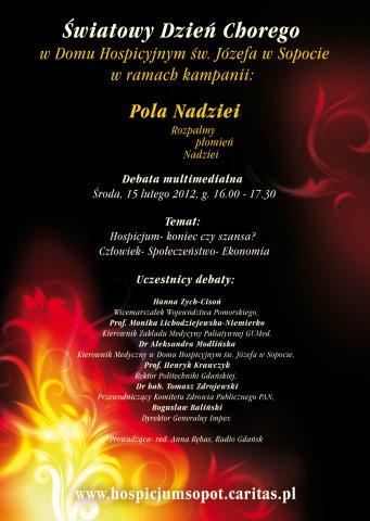 Hospicjum – koniec czy szansa? Próbę odpowiedzi na to pytanie w trzech wymiarach: Człowieczeństwo – Społeczeństwo – Ekonomia, będzie można usłyszeć podczas debaty, która odbędzie się w ramach Światowego Dnia Chorego w środę 15 lutego w Domu Hospicyjnym św. Józefa w Sopocie Caritas Archidiecezji Gdańskiej. W spotkaniu otwartym wezmą udział Hanna Zych-Cisoń, Wicemarszałek Województwa Pomorskiego, prof. Monika Lichodziejewska-Niemierko, Kierownik Zakładu Medycyny Paliatywnej Gdańskiego Uniwersytetu Medycznego, dr Aleksandra Modlińska, Kierownik Medyczny w Domu Hospicyjnym św. Józefa w Sopocie, prof. Henryk Krawczyk, Rektor Politechniki Gdańskiej, dr hab. Tomasz Zdrojewski, Przewodniczący Komitetu Zdrowia Publicznego PAN, Bogusław Baliński, Dyrektor Generalny Impex. Debatę poprowadzi red. Anna Rębas z Radia Gdańsk.