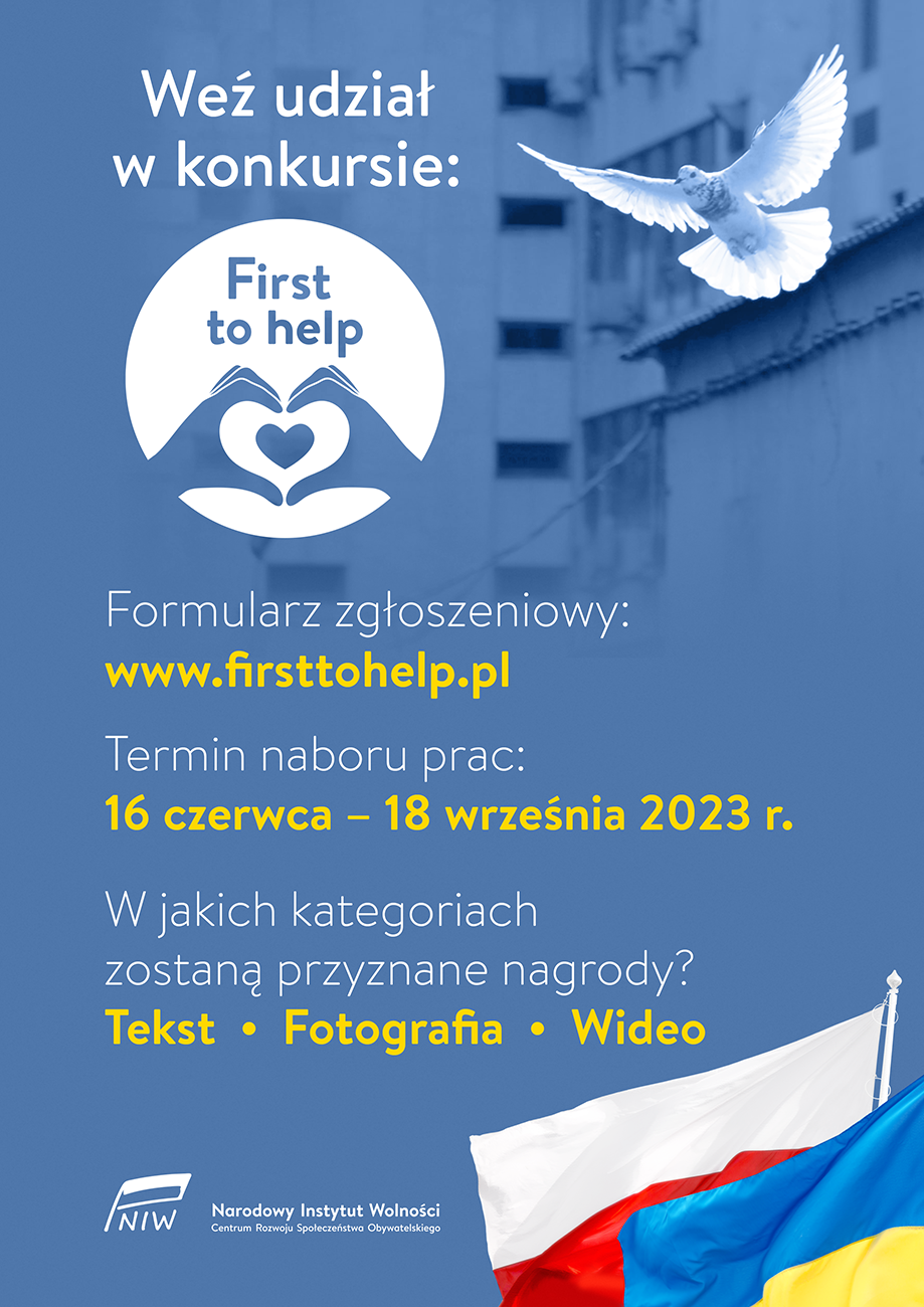 Skuteczna pomoc ofiarom rosyjskiej agresji na Ukrainę nie byłaby możliwa bez zaangażowania dziesiątek tysięcy osób, które działały na terenach dworców, granicach, w punktach recepcyjnych i innych miejscach w całej Polsce – wszędzie tam, gdzie niezbędna okazywała się ich obecność. Mijające miesiące wojny uświadomiły opinii publicznej, jak ważne i potrzebne było wsparcie zaoferowane przez Polaków. Jego skala rodzi potrzebę nie tylko głębszego zrozumienia niezwykłego zjawiska, którego byliśmy świadkami, ale też utrwalenia jego efektów. Odpowiedzią na tę potrzebę jest konkurs „First to help”, który powstał z inicjatywy Przewodniczącego Komitetu ds. Pożytku Publicznego prof. Piotra Glińskiego. Za realizację projektu odpowiedzialny jest Narodowy Instytut Wolności-Centrum Rozwoju Społeczeństwa Obywatelskiego.