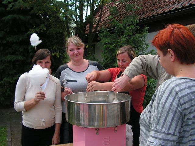 Wykorzystując ładną pogodę i ostatnie ( niestety!!! ) podmuchy lata postanowiliśmy po ostatnich bardzo pracowitych dniach ( przygotowanie uroczystości odpustowych ) trochę się zrelaksować. Zatem spędziliśmy ten dzień w naszym ogródku, który lada moment zamieni się w plac budowy i „kręciliśmy watę”. Zabawa okazała się przednia, śmiechu było co nie miara, ale przecież o to nam chodziło.