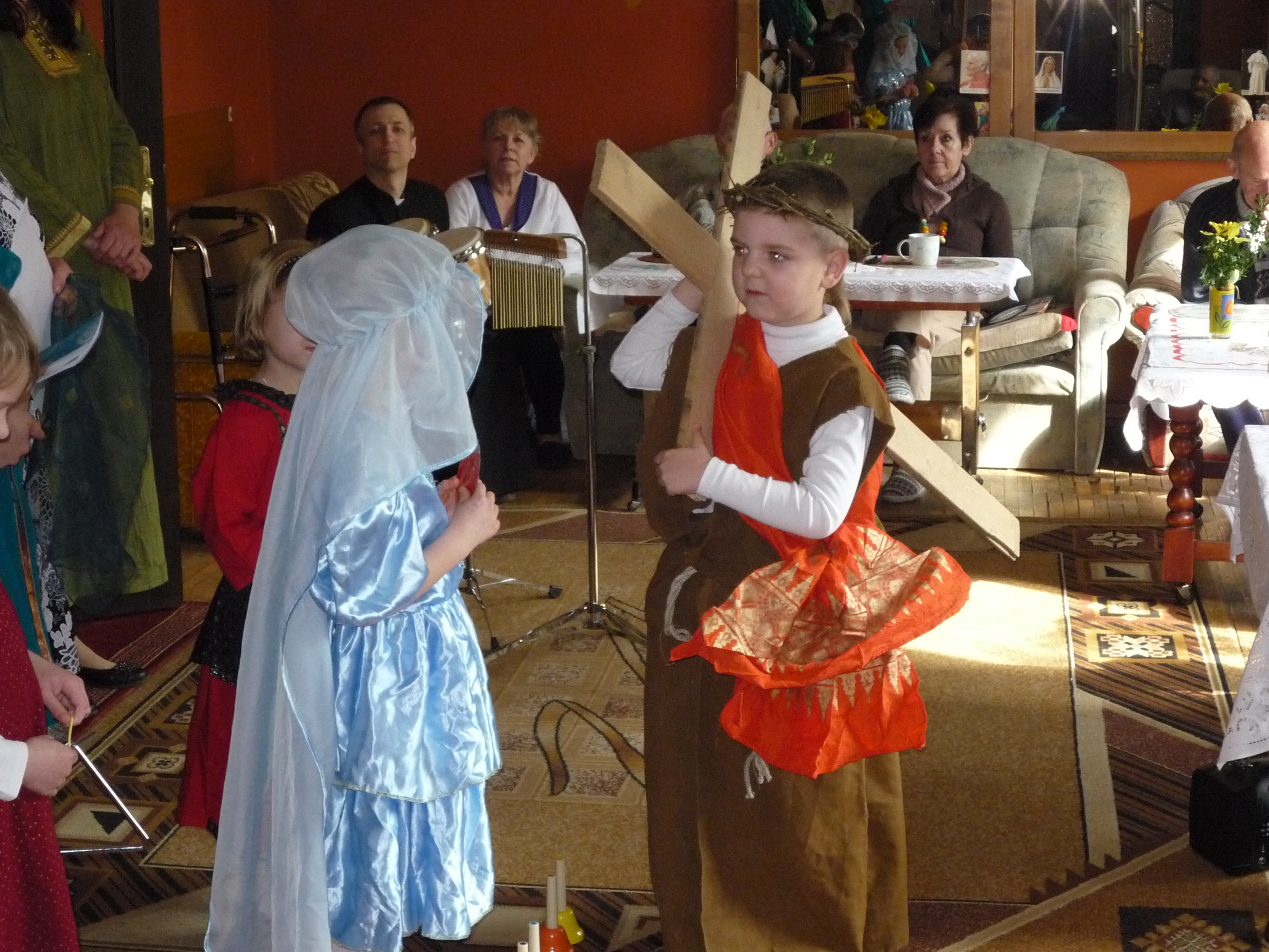 W związku z Wielkanocą nasze kwietniowe  spotkania w ramach Warsztatów Artystycznych związane były z przygotowaniem i wystawieniem „Misterium Męki Pańskiej” w Domu Seniora w Rumi. Było to śpiewane przedstawienie i wzięły w nim udział wzięły 3 pokolenia. W przedstawieniu wykorzystano instrumenty muzyczne takie jak: bongosy, dzwonki, dzwoneczki rurowe, trójkąty i grzechotki, aktorzy w miarę możliwości byli przebrani w stroje oddające namiastkę tamtych czasów i miejsca, był też krzyż, młotek. Wykorzystano efekty dźwiękowe burzę i ciszę, dzwony kościelne. Wielkie wrażenie wśród aktorów zrobiły dzieci, wcielając się w rolę cierpiącego Jezusa niosącego Krzyż oraz Weroniki, która otarłszy twarz Jezusowi pokazała mieszkańcom domu chustę z odzwierciedlonym wizerunkiem Pana Jezusa. Na koniec przedstawienia wręczono własnoręcznie wykonane kartki, z których mieszkańcy i pracownicy również się ucieszyli. Atmosfera była dostojna, uroczysta, skłaniająca do refleksji, zadumy, niosąca pokój w sercu.