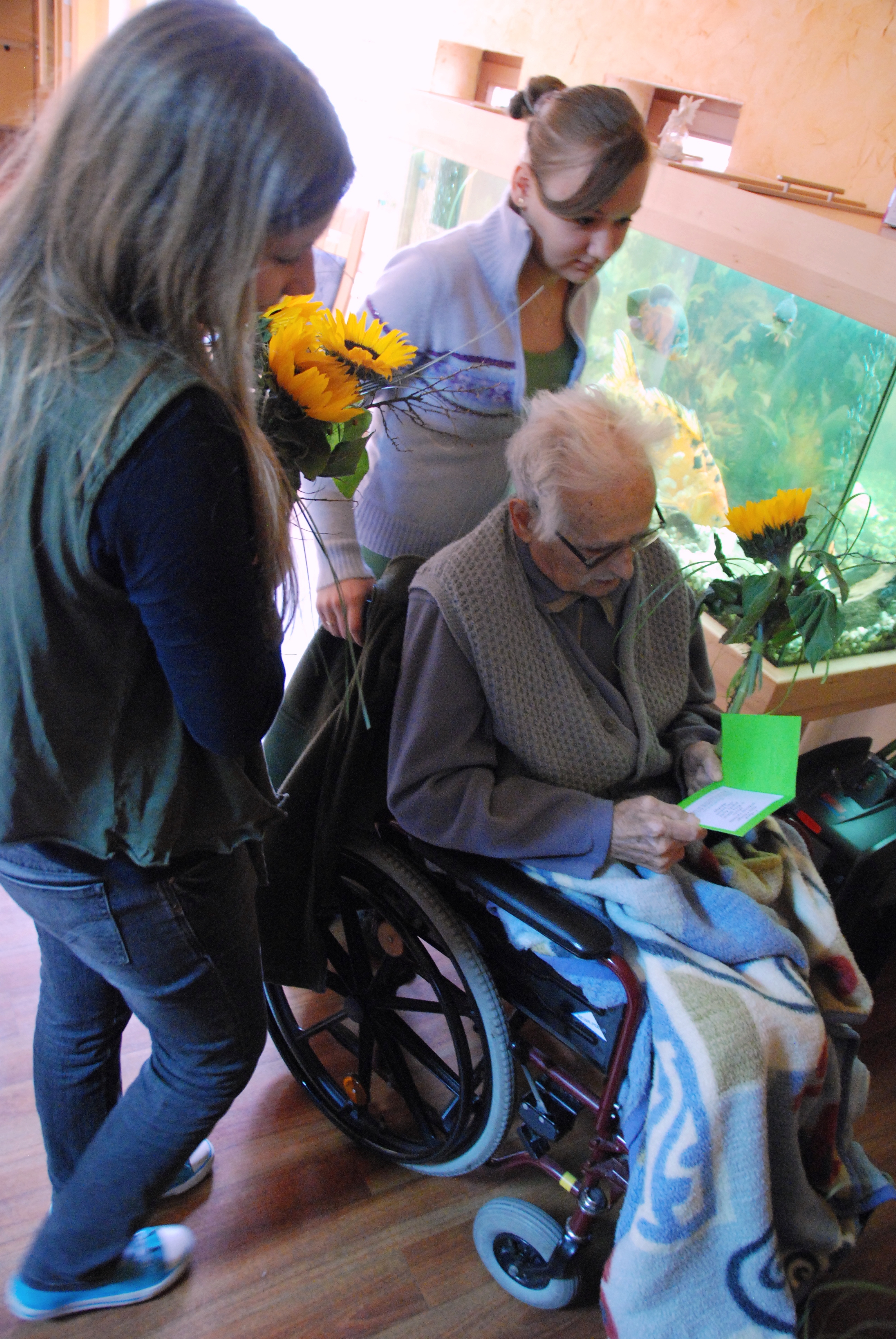 Po multimedialnej prezentacji młodzi ludzie spotkali się z naszymi pacjentami. Przekazali im przygotowane wcześniej kartki z życzeniami oraz piękne kwiaty słoneczników.