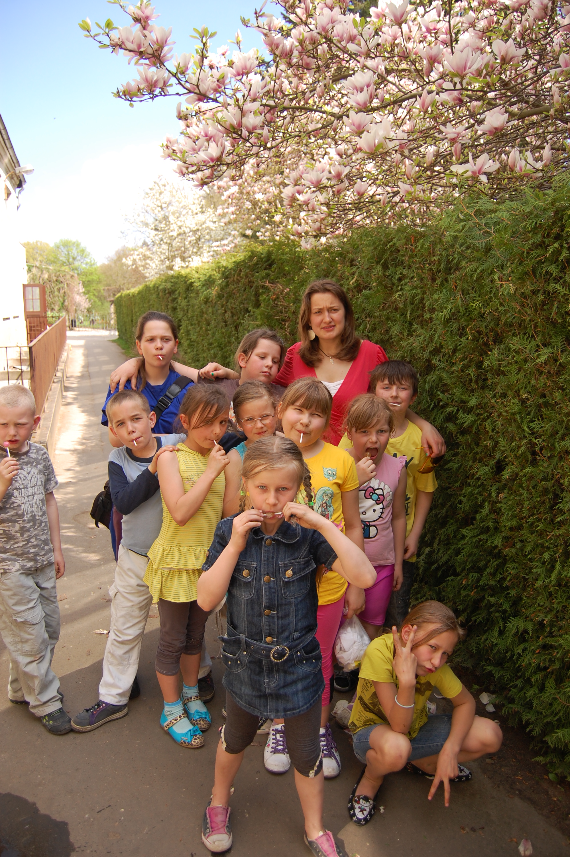 Niepewni pogody pojechaliśmy do parku oliwskiego, by oglądać kwitnące magnolie. Wcześniej przygotowaliśmy prowiant na drogę. Przechadzając się po alejkach i podziwiając nature, napotkaliśmy młodego pana w koloratce, który przedstawił się, że jest kolegą wujka Wiesia. Przesłał on pozdrowienia od niego wraz z workiem lizaków. Uradowani zadzwoniliśmy do wujka Wiesia i podziękowaliśmy. Po spacerze udaliśmy się szybkim krokiem do tramwaju. Na szczęście udało nam się zdążyć przed burzą. Czekamy na poprawę pogody, by móc pójść na lody.