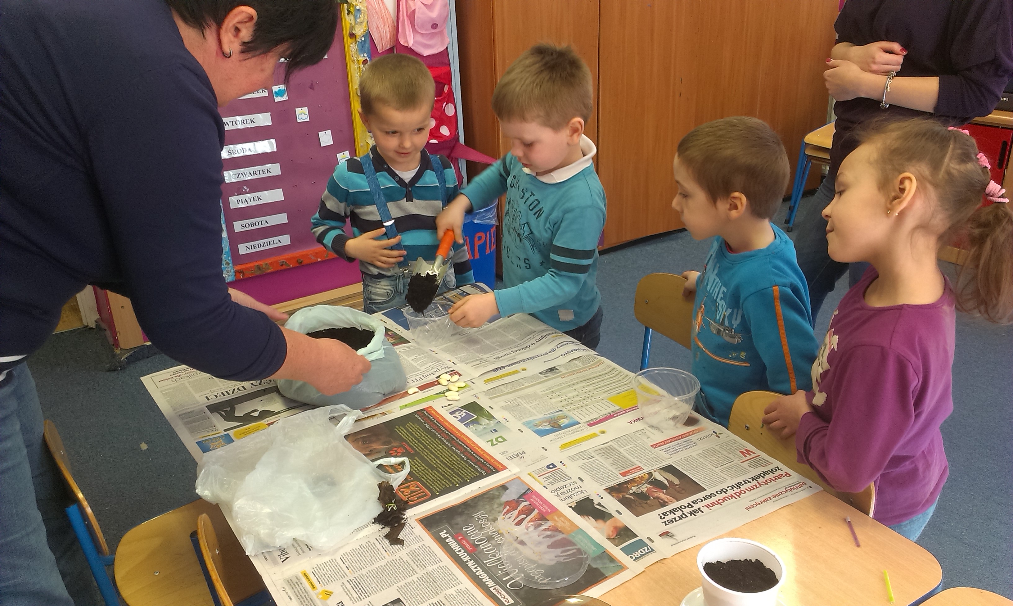 Z okazji nadejścia wiosny maluchy z grupy „Radosne Krasnale” postanowiły zabawić się w wiosennych ogrodników. Z godnie z instrukcjami Królika, przyjaciela Kubisia Puchatka do przygotowanych pojemników włożyły nasiona fasoli i oczekują na plony:)