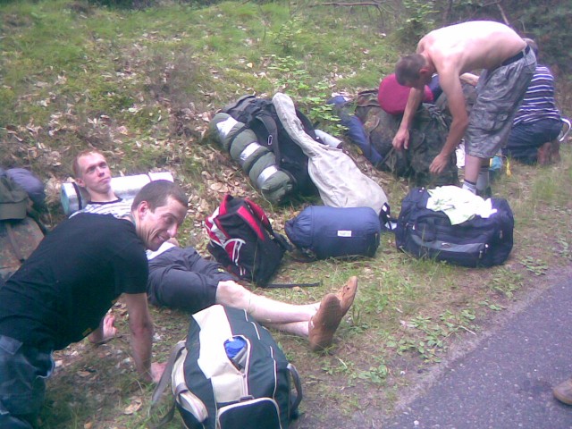 Nad jezioro Radolin droga wiodła przez las, dla niektórych 5 kilometrowy marsz był znacznym wysiłkiem i dało się to odczuć na własnych plecach. W drodze nad jezioro wrażeń dostarczyła uwiązana na ścieżce krowa, która szalejąc zatarasowała nam droge, przerażeni zaczęliśmy wołać instruktora. Spotkaliśmy także harcerzy na biegu patrolowym. Po dotarciu nad jezioro zaczęliśmy zbierać opał a instruktor zbudował szybko kuchnię polową z kamieni na której następnie przygotowaliśmy kolację. Po posiłku rozbiliśmy namioty. Potem mycie w jeziorze, do zimnej wody niektórzy wchodzili ze znacznymi oporami więc trzeba było im pomóc 🙂 Dwóch z nas nie mogło się rozstać ze swoimi plecakami i namiętnie rozpakowywali i pakowali je po kilka razy dziennie. W nocy trzymaliśmy straż przy namiotach co było nie lada przeżyciem. Były rozmowy jak poradzić sobie w warunkach polowych oraz ognisko i śpiewy przy dźwiękach gitary instruktora. Uzbierane jagody zostały zjedzone z makaronem po prostu pycha. Ten wyjazd pozwolił każdemu z nas sprawdzić się w trudnych polowych warunkach i nauczył rozwiązywać stojące przed nami zadania. Piękny krajobraz, czysta woda, znakomita słoneczna pogoda i spanie w namiotach pod rozgwieżdżonym niebem dostarczyły wielu niezapomnianych wrażeń i wspomnień.