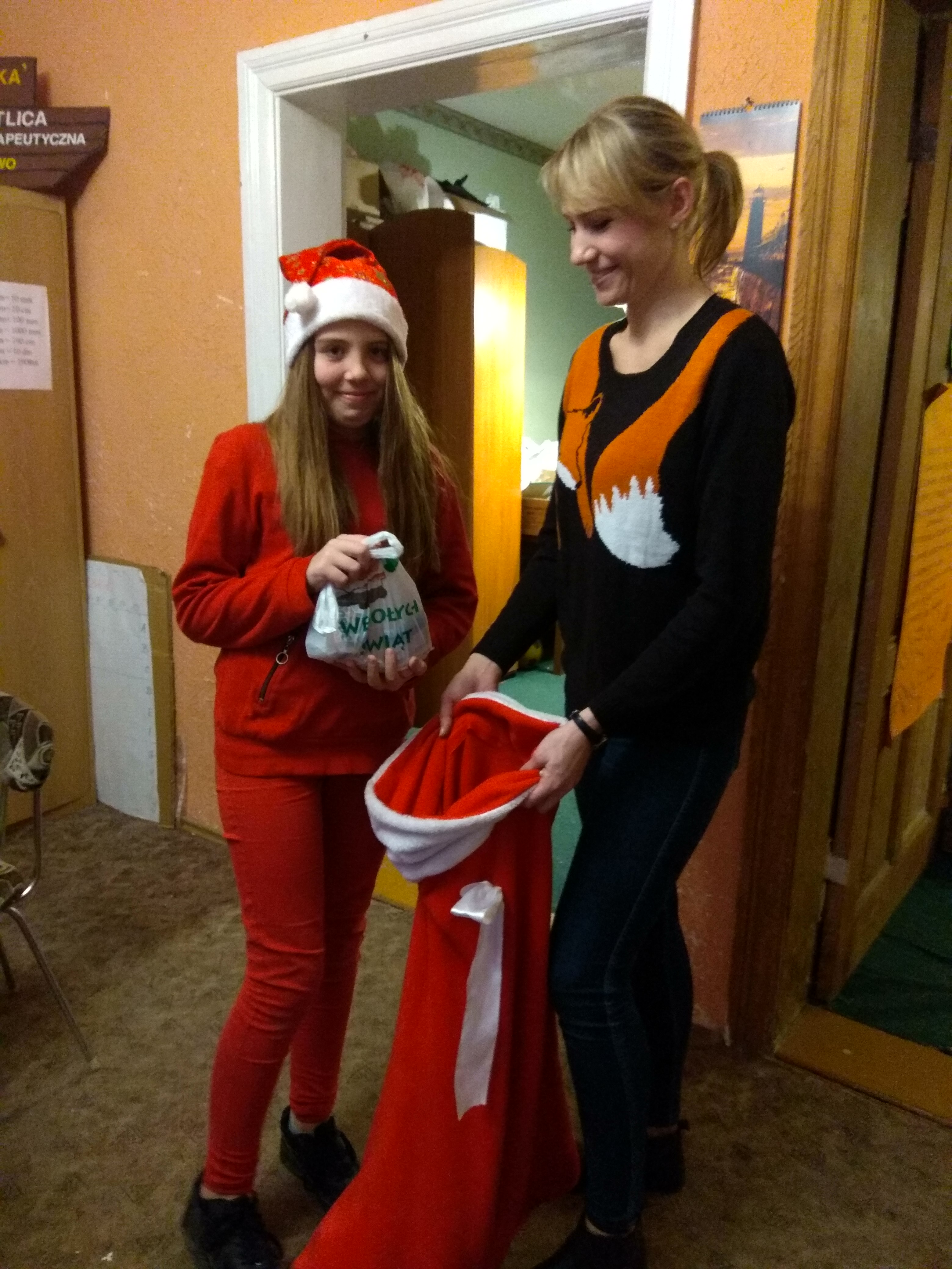 Po solidnym posiłku i robieniu kartek wreszcie nadszedł czas na paczki od Mikołaja! Pani Gosia założyła wielki wór na ramię i z niego wyciągała dla każdego wspaniałe, słodkie upominki 🙂 Radosny i bardzo smaczny to był dla nas wieczór!