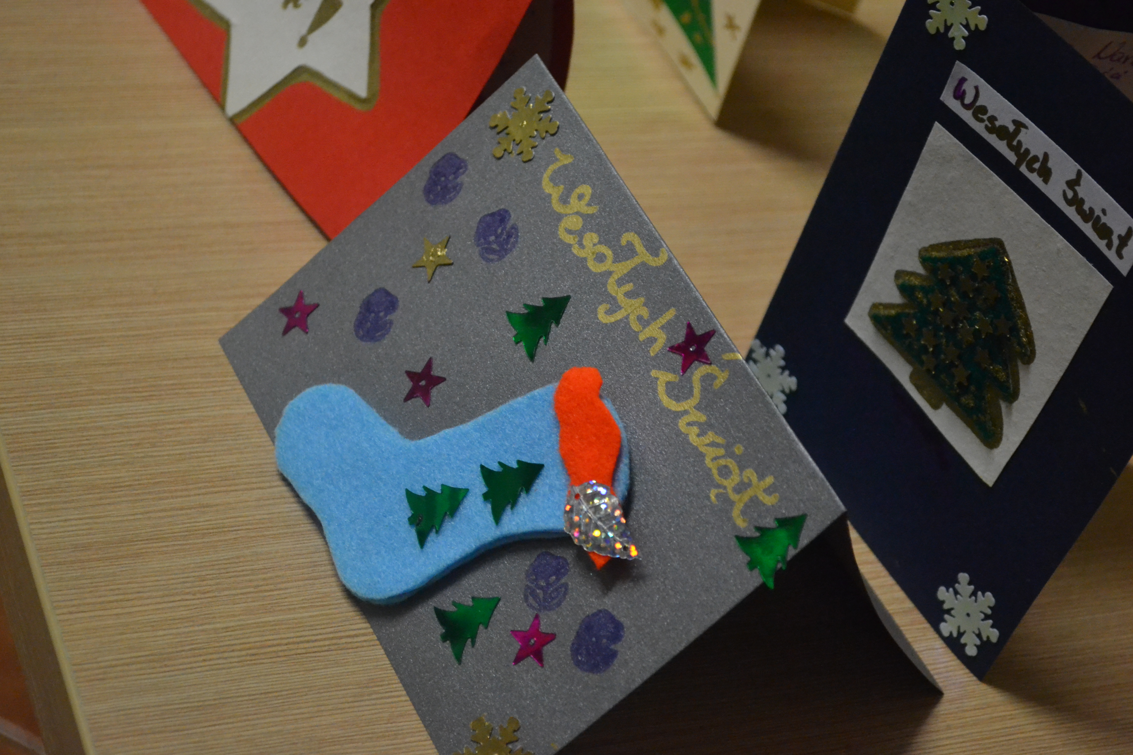 Mieszkańcy tego domu święta spędzają poza swoim domem rodzinnym i chcąc umilić im ten czas zdecydowaliśmy się przygotować dla nich świąteczne pocztówki. Wszyscy ochoczo zabrali się do pracy. Nasza wyobraźnia nie znała granic i na koniec zajęć pochwalić się mogliśmy kolorową galerią kartek świątecznych. Drugim etapem pracy było wyszukanie z listy podopiecznych niegowskiego domu osób, do których napiszemy życzenia. Każda z kartek została imiennie zaadresowana i podpisana przez autora. Wszyscy chętnie zaangażowali się w te działania. Bo jak napisali organizatorzy akcji: „W takich chwilach najzwyklejsza kartka z życzeniami jest jak koło ratunkowe. Znak pamięci, nadzieja, miłość upchnięta          w         kopercie”.