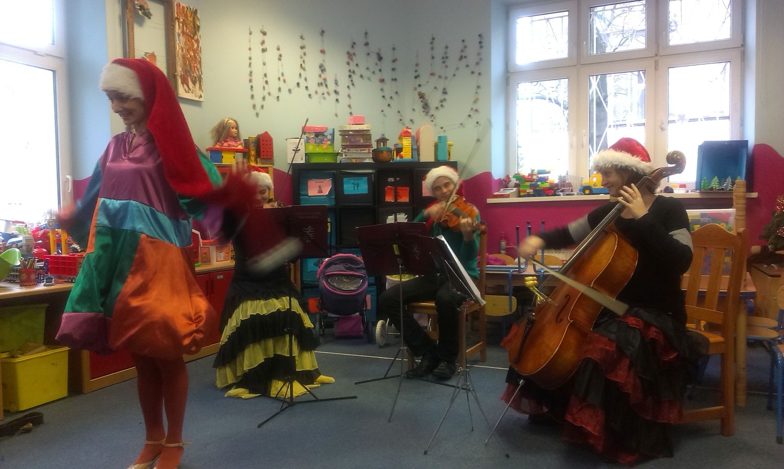 W miniony wtorek odwiedzili nas muzycy z grupy artystycznej „Pro- Musica”, z kolejnym koncertem. Tym razem dzieci usłyszały opowieść o saniach św. Mikołaja i Królowej Śniegu. Wspólnej zabawie i tańcom, towarzyszyła muzyka skrzypiec, altówki i wiolączeli.