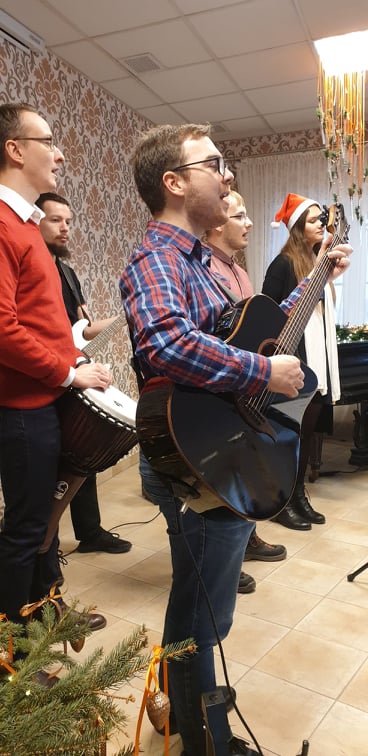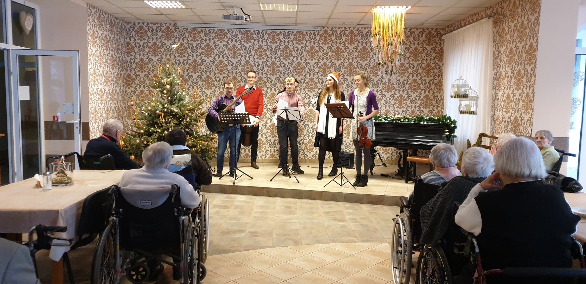 Śpiewanie kolęd to jedna z najpiękniejszych i najbardziej lubianych w Polsce bożonarodzeniowych tradycji . Niedzielne przedpołudnie upłynęło Mieszkańcom Centrum Pomocowego Caritas im. św. Jana Pawła II pod znakiem kolędy.  Studenci Duszpasterstwa Akademickiego „Na Czarnej” wprowadzili nas w niepowtarzalny klimat tradycyjnych kolęd i pastorałek. Mogliśmy jeszcze poczuć atmosferę świąt Bożego Narodzenia  i wspólnie pośpiewać  świąteczne utwory.  Zapewniamy, że bezcen ne wrażenia, radość i światło bijące z przekazu  będziemy długo wspominać…