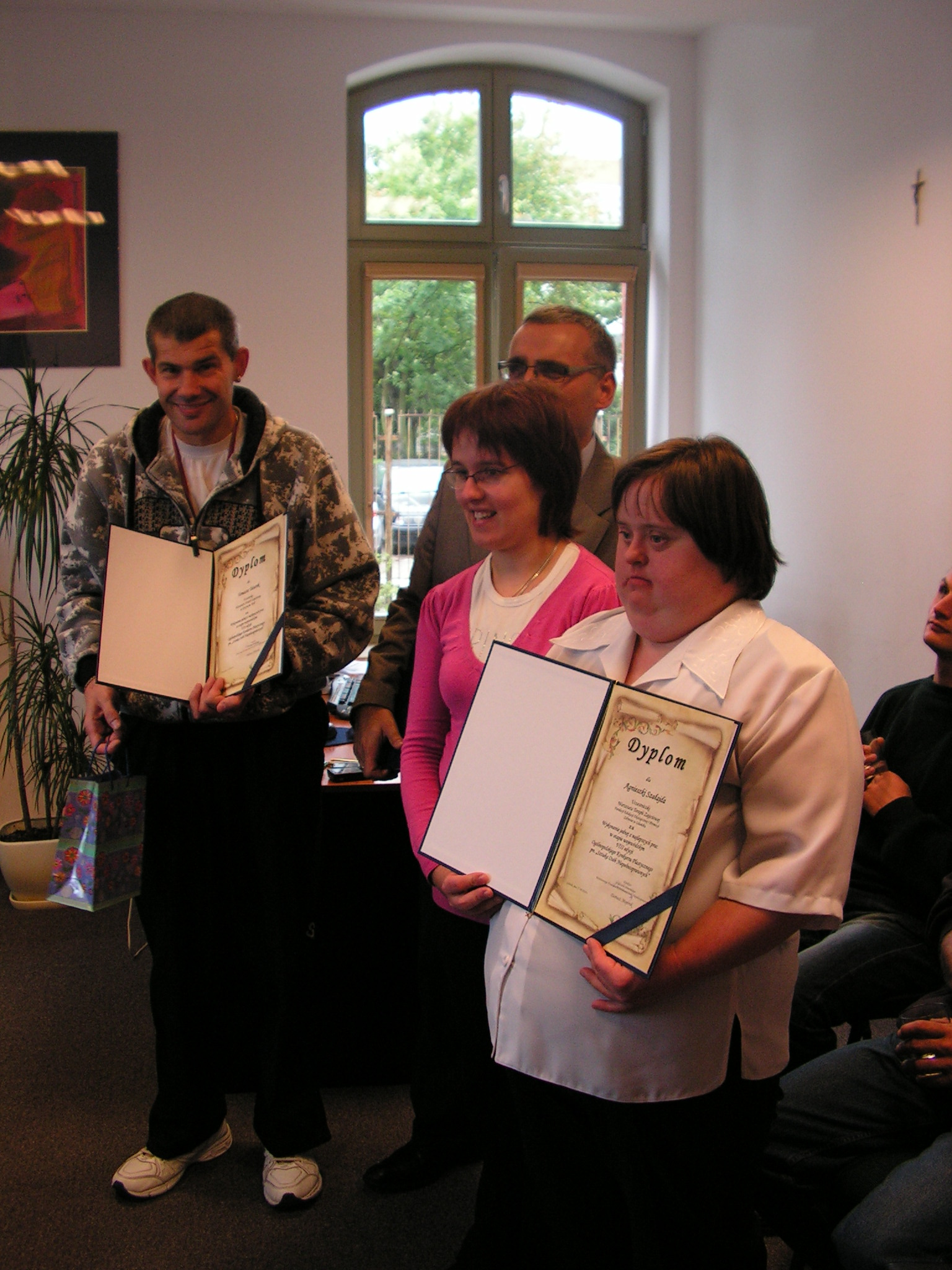 Dnia 29.09.2010 nasz podopieczny Tomasz został zaproszony do siedziby PFRON- u , aby odebrać dyplom oraz nagrodę za wykonanie jednej z najlepszych prac w etapie wojewódzkim VIII edycji Ogólnopolskiego Konkursu Plastycznego pt „ Sztuka Osób Niepełnosprawnych”. Tomek przyjął gratulacje i nagrodę z rąk Dyrektora PFRON-u p. Dariusza Majorka, który bardzo podkreślał jak szczególna i cenna jest praca twórcza osób niepełnosprawnych dla nich samych oraz całego społeczeństwa.  Obecnie czekamy na wyniki kolejnego etapu konkursu w warszawskim PFRON. Cieszymy się ogromnie z uhonorowania naszego podopiecznego i życzymy kolejnego sukcesu w finale.