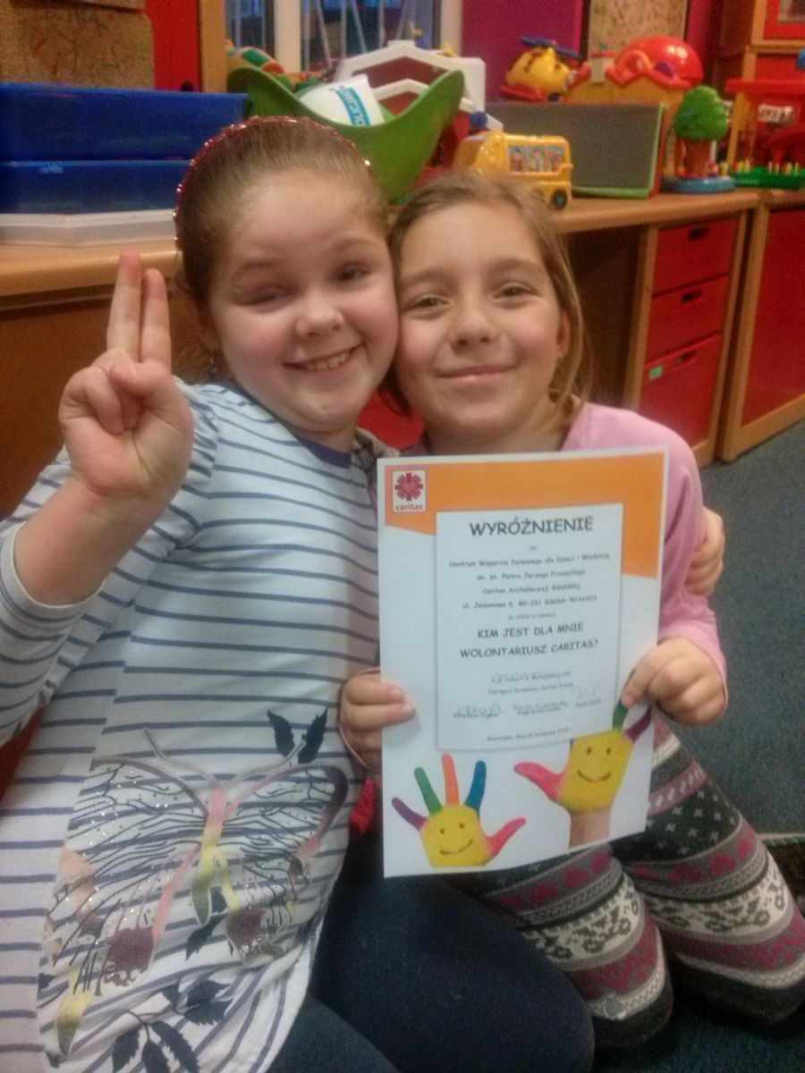 Dzieciaki z „Anielskiej Krainy” braly udział w konkursie organizowanym przez Caritas Polska pod tytułem: „Kim jest wolontariusz Caritas?” Wykonały pracę plastyczną, która została wyróżniona i nasze Centrum otrzymało dyplom oraz multimedlialną tablicę Mimio Teach. Podopieczni cieszą się niezwykle docenieniem ich pracy i dziekują organizatorom konkursu 🙂