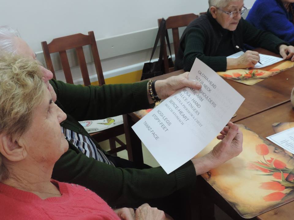 Nasza wolontariuszka z Gruzji – Mari uczy seniorów języka angielskiego. Seniorzy chętnie słuchają, notują oraz powtarzają słówka, ale także przygotowują pomoce naukowe. Mamy za sobą naukę nazw części ciała oraz twarzy, nazw kolorów oraz ubrań.