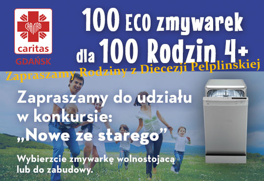 Z wielką radością dziś ogłaszamy nasz nowy konkurs ekologiczny pn.: „Nowe ze starego”. Konkurs jest częścią Programu Rodzina+, w ramach którego gdańska Caritas wspiera rodziny wielodzietne. Każda rodzina, zamieszkująca teren archidiecezji gdańskiej i mająca nie mniej niż czworo dzieci jest zaproszona to tego, by wziąć udział w konkursie. Nagrodą jest 100 energooszczędnych zmywarek. By mieć szansę na zmywarkę rodzina powinna stworzyć NOWY przedmiot użytkowy. Ale przedmiot zrobiony powinien być ze STARYCH rzeczy i materiałów, rozumianych jako surowce wtórne. Czyli różnego rodzaju odpady, materiały lub zużyte produkty, które nadają się do ponownego wykorzystania.