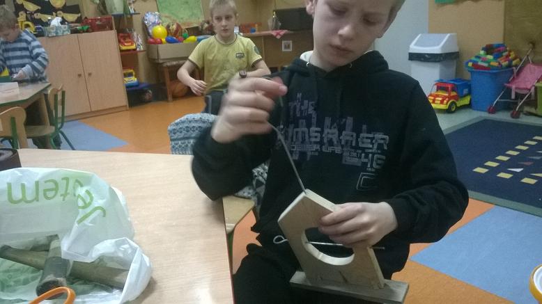 Z entuzjazmem przystąpiono do działania!  Zbijaliśmy, montowaliśmy i powstały małe arcydzieła.  Przy okazji była fajna współpraca między dziećmi.