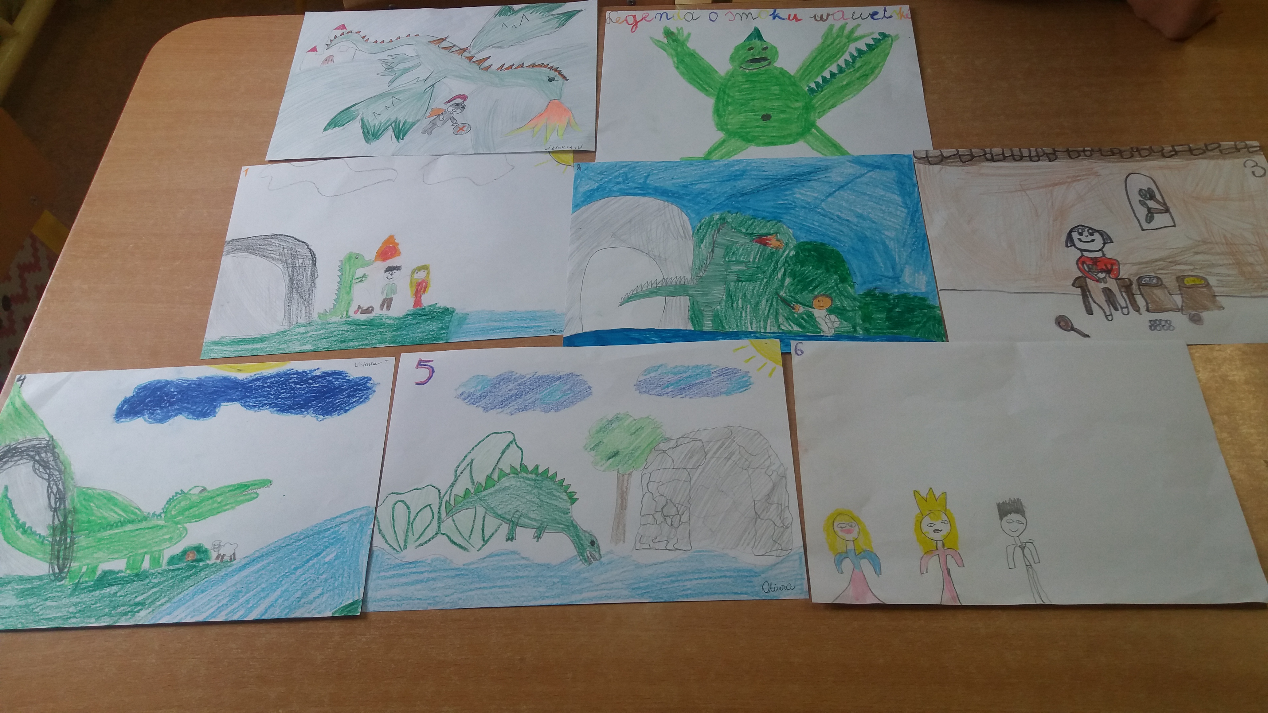W czasie majowych spotkań dzieci ze świetlicy Caritas w Tuchomiu poznały legendę „O smoku wawelskim”. Dowiedziały się także, jak wyglądało życie królów i życie poddanych. Najciekawsza dla dzieci była legenda i w związku z tym, dzieci ją zilustrowały i wzajemnie sobie ją opowiadały. Na zajęciach, poruszyliśmy także trudny, społeczny temat – nadużywania alkoholu. Dzieci wspólnie i jednogłośnie stwierdziły, że alkohol jest szkodliwy, powoduje niewłaściwe zachowanie ludzi i nikt nie powinien spożywać alkoholu w swoim życiu. Dzieci są na tyle świadome problemu, że postanowiły rozdawać ludziom ze swojego najbliższego otoczenia ulotki, które same zaprojektowały.