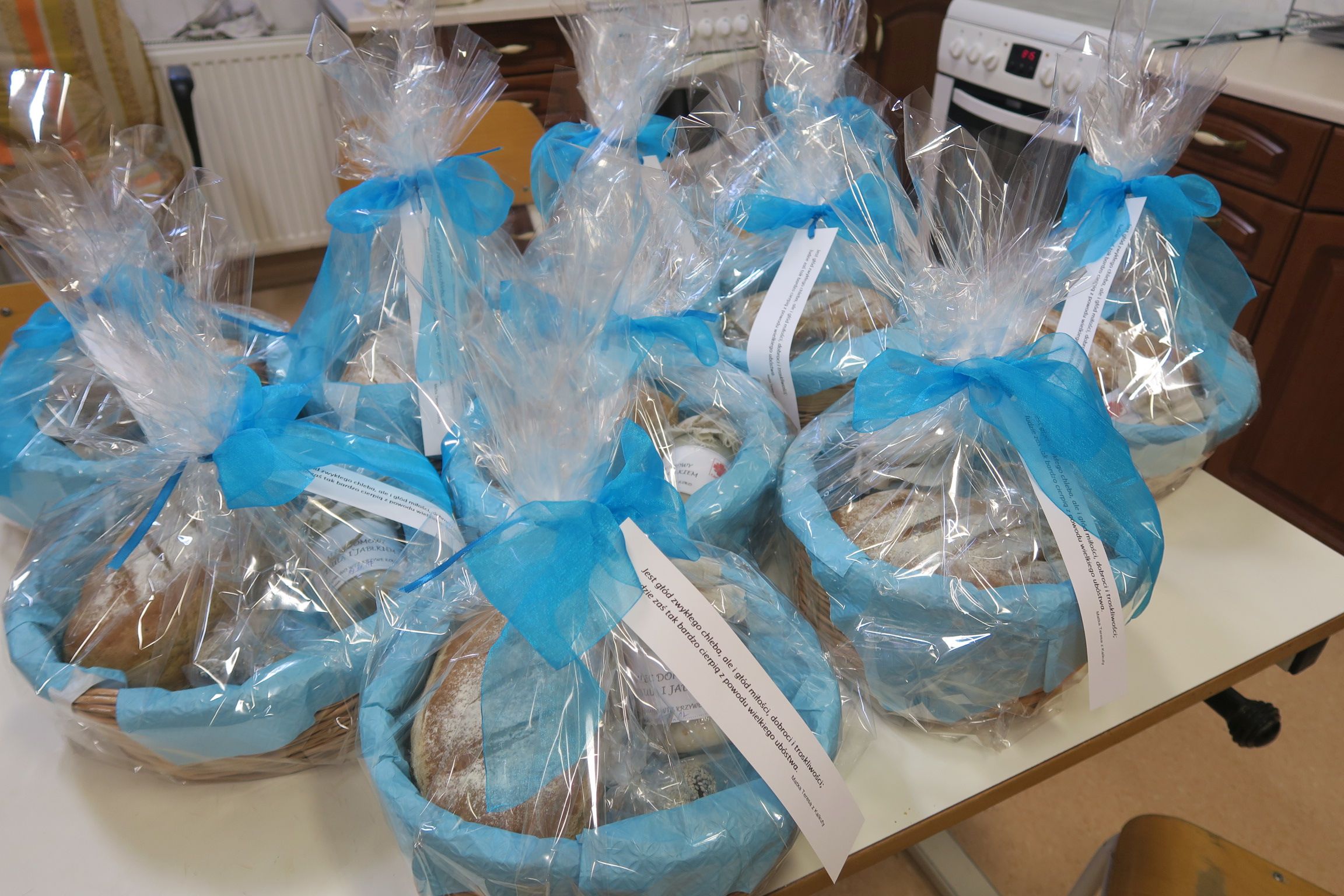 Te przypadkowo przeczytane słowa stały się dla nas bodźcem do działania. Kuchnia Dydaktyczna naszego Warsztatu przygotowała pyszny smalec, upieczono chlebek i pierniki w kształcie serca. Uczestnicy z pracowni tkacko – wikliniarskiej podarowali własnoręcznie wyplecione koszyki, a pracownia galanterii papierniczej przygotowała kartki z pięknymi przesłaniami naszej patronki św. Matki Teresy z Kalkuty. I tak z tymi drobnymi upominkami udaliśmy się do naszych sąsiadów. Reakcje wielu osób nas zaskoczyły – od zaskoczenia do wzruszenia i łez. Jesteśmy przekonani, że te spotkania były ważne nie tylko dla osób obdarowywanych, ale również dla nas. Po raz kolejny doświadczyliśmy, że kontakt z drugim człowiekiem to rzecz bezcenna.