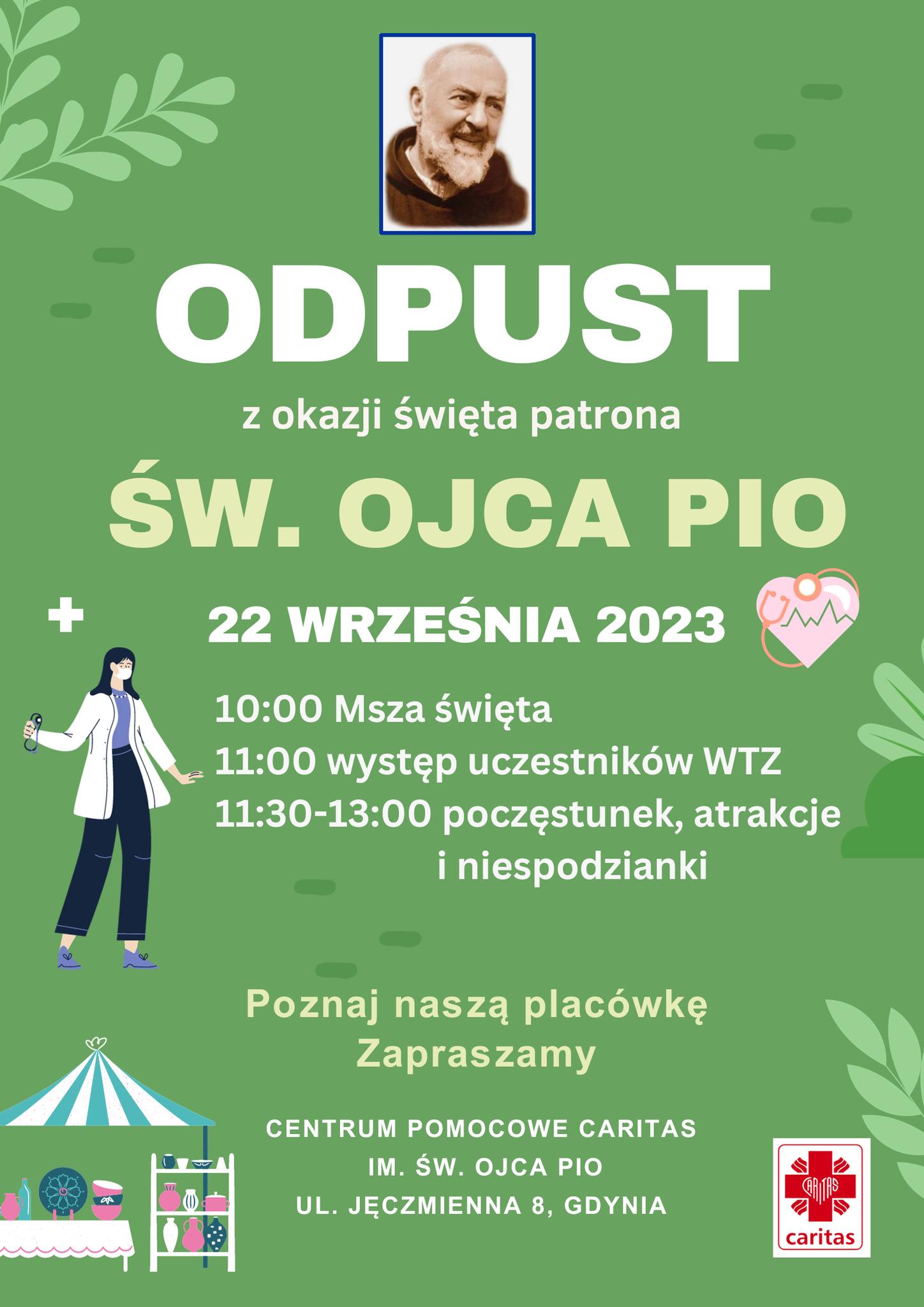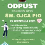 Pokaż większy obrazek ODPUST św. o. Pio w Gdyni Już 22 września zapraszamy na Odpust św. o. Pio w naszej placówce w Gdyni . W programie: występy podopiecznych Warsztatów Terapii Zajęciowej oraz moc zabaw i atrakcji. Start: 11.00 Miejsce: Centrum Pomocowe Caritas i Warsztat Terapii Zajęciowej Gdynia (ul. Jęczmienna 8, Gdynia) Do zobaczenia! By Placówki CAG|2023-09-25T09:37:21+02:0018 września 2023|Aktualności|Możliwość komentowania ODPUST św. o. Pio w Gdyni została wyłączona Podziel się tym ze znajomymi! FacebookTwitterRedditLinkedInWhatsAppTumblrPinterestVkXingEmail O autorze: Placówki CAG Podobne wpisy Wspomnień ciąg dalszy- Wakacyjne przygody w świetlicy- lato pełne radości i niezapomnianych chwil! Gallery Wspomnień ciąg dalszy- Wakacyjne przygody w świetlicy- lato pełne radości i niezapomnianych chwil! Wakacyjne wspomnienia- Zielona Szkoła w Schodnie – tydzień przygód, zabawy i kaszubskich inspiracji Gallery Wakacyjne wspomnienia- Zielona Szkoła w Schodnie – tydzień przygód, zabawy i kaszubskich inspiracji Frassati-wakacyjne sierpniowe wspomnienia Gallery Frassati-wakacyjne sierpniowe wspomnienia Pielgrzymka wspólnot Caritas Gallery Pielgrzymka wspólnot Caritas