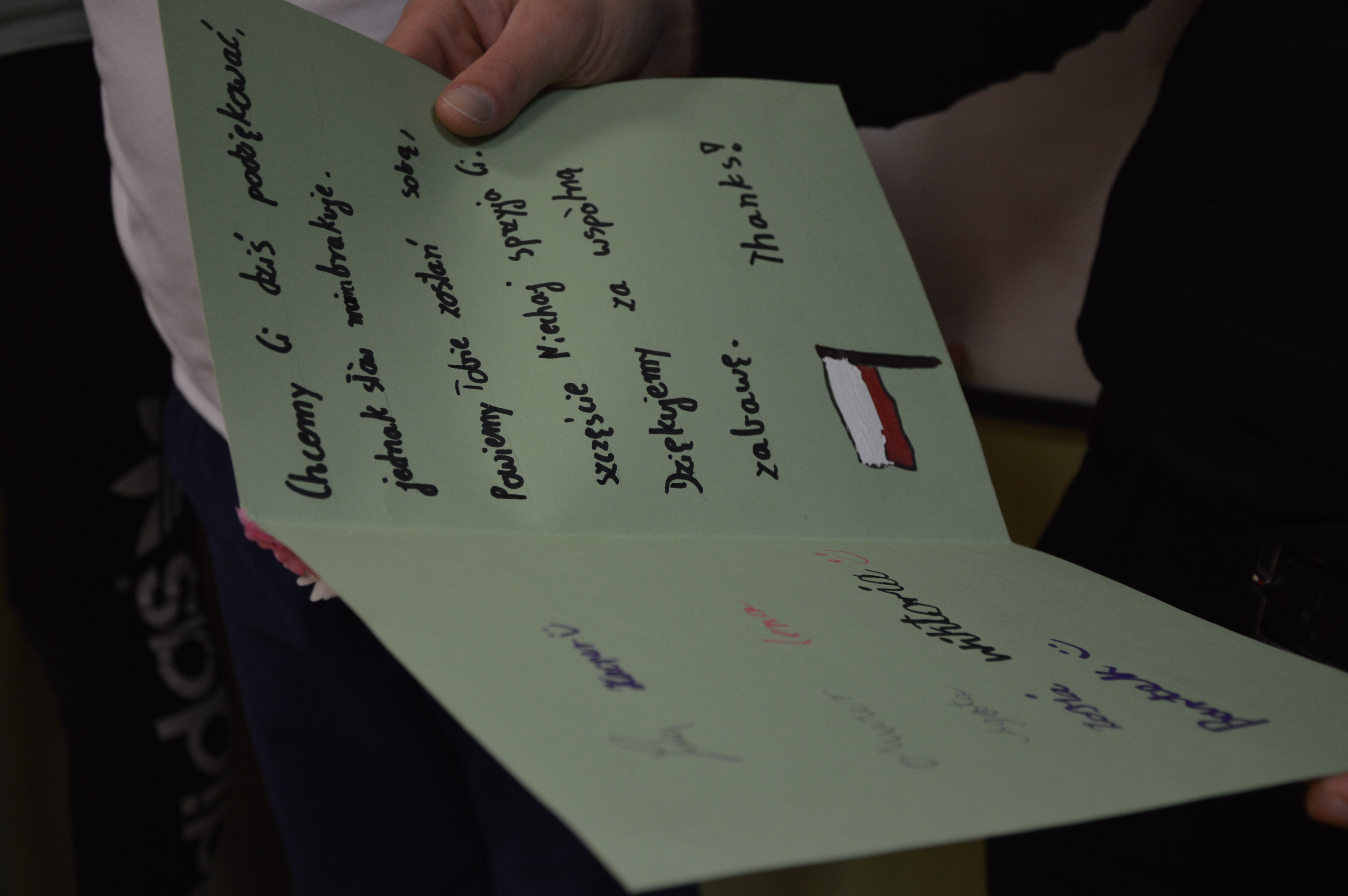 Wczoraj nasi wolontariusze zagraniczni wybrali się z wizytą do świetlicy w Borkowie. Tym razem była to białorusko-gruzińska ekipa, czyli Natasha i Irakli. Oboje mówią całkiem nieźle po polsku, więc nie było problemu z porozumieniem. Dzieci chętnie weszły w rolę nauczycieli i pomagały gościom znaleźć odpowiednie słowa, kiedy czegoś nie potrafili powiedzieć. Okazało się też, że kilka osób w grupie całkiem nieźle radzi sobie z angielskim i w razie czego służyło za tłumaczy.